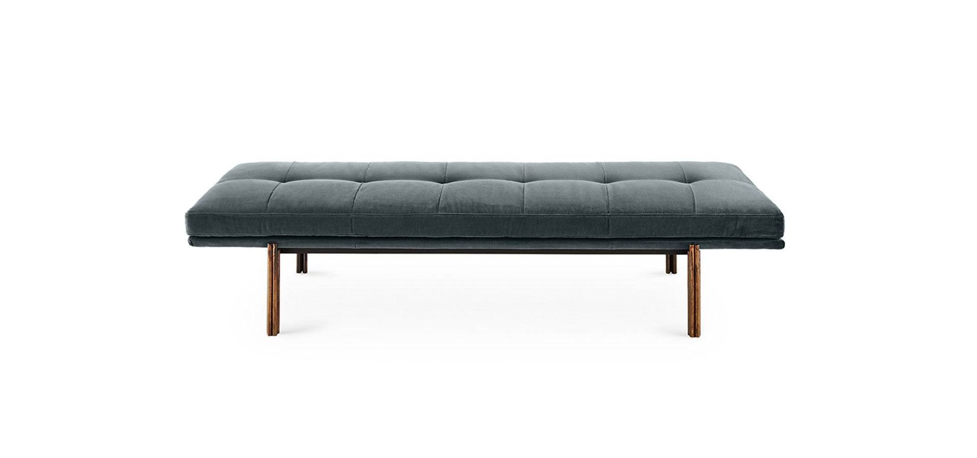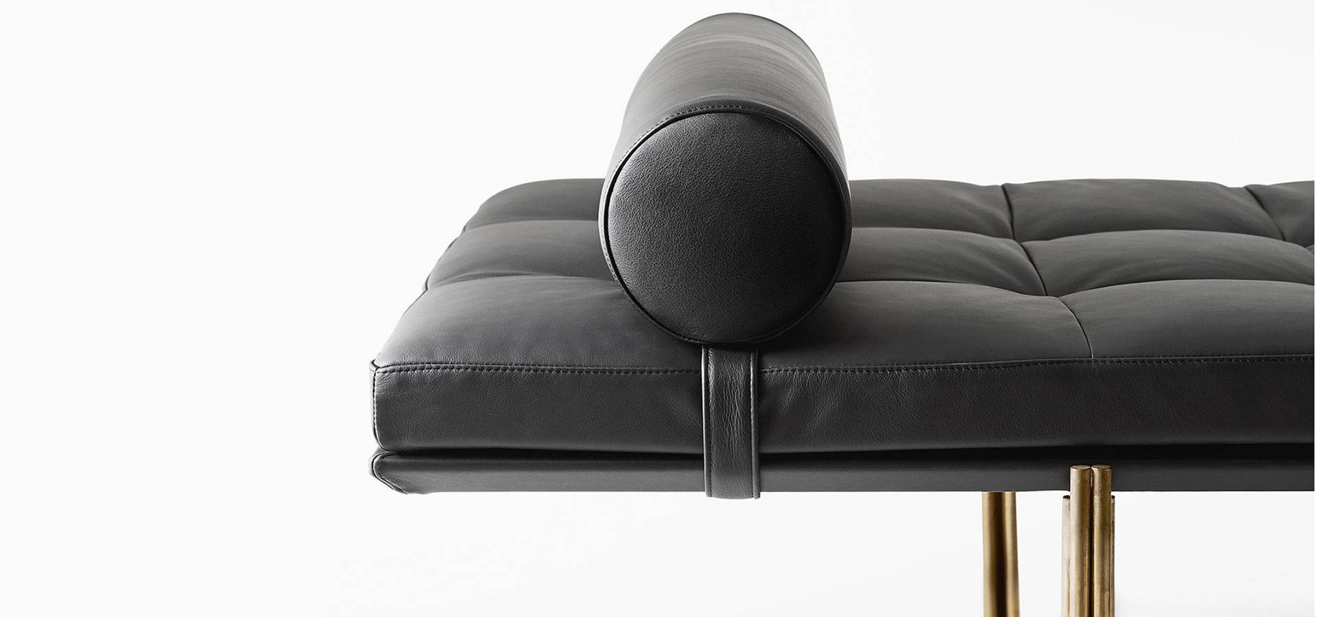 Hand-burnished metal structure with polyurethane foam mattress upholstered in cloth or leather in the samples' colors. For the 200 centimeter variant, a headrest is provided.