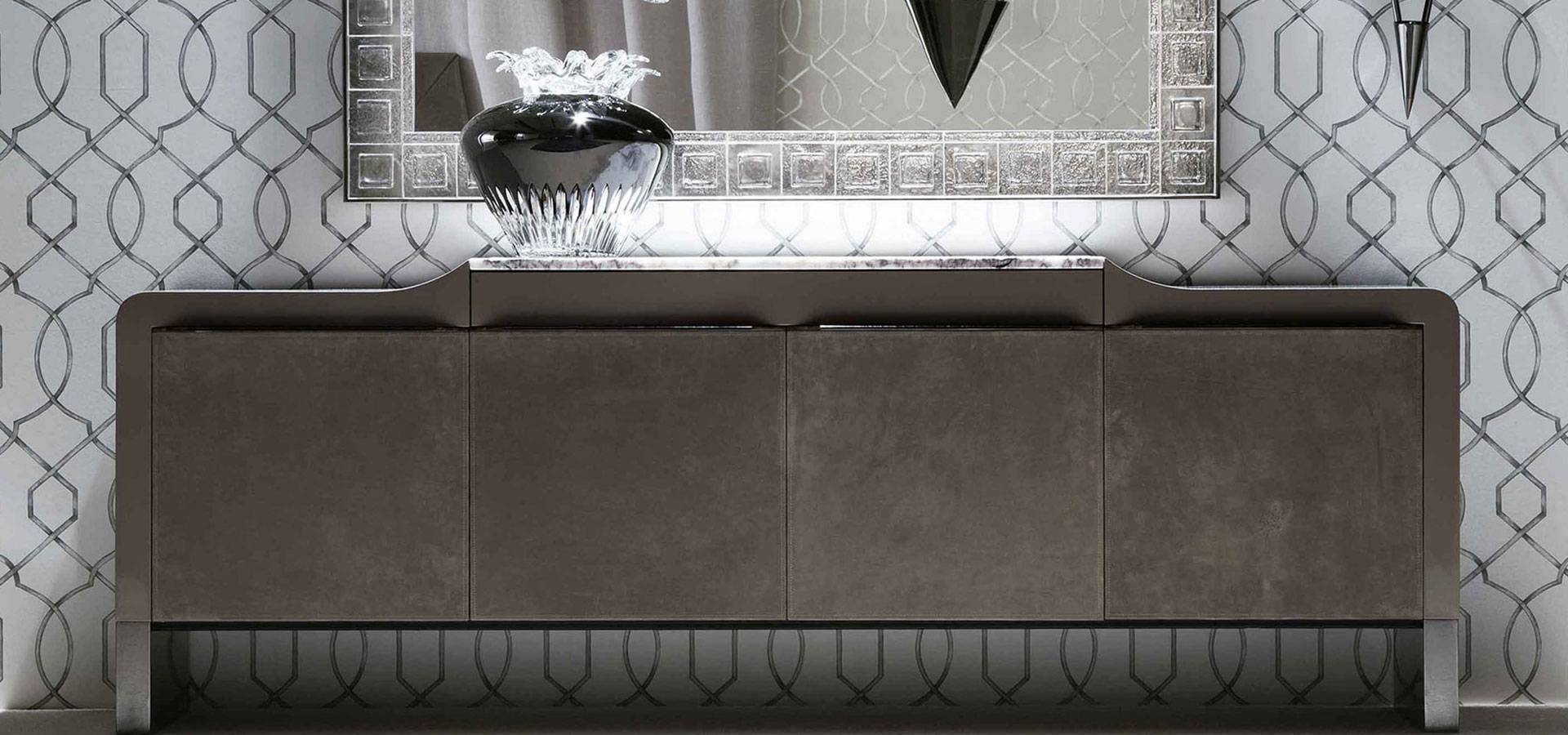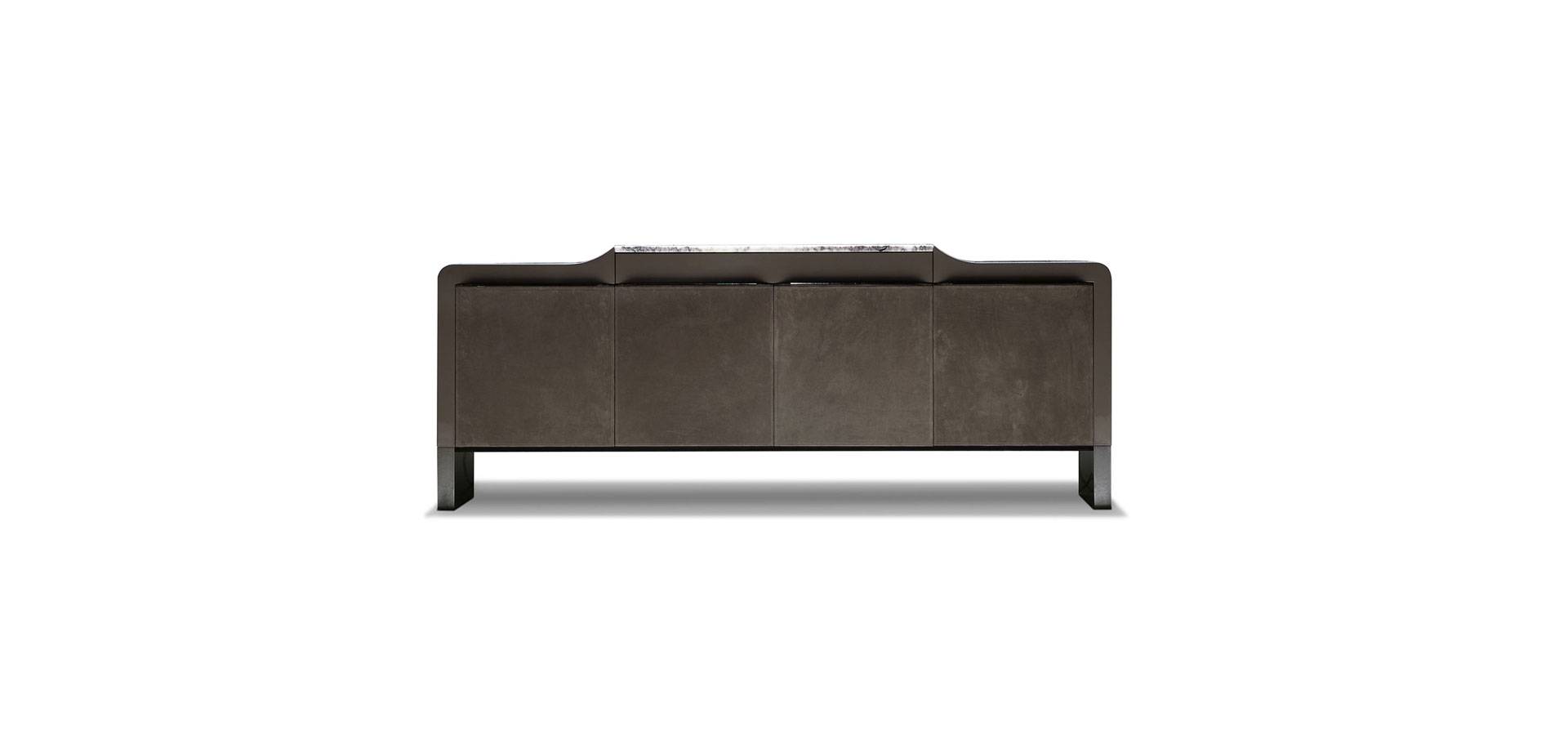 Natural protected nubuk leather buffet with marble top and high gloss polyester grey lacquer construction.