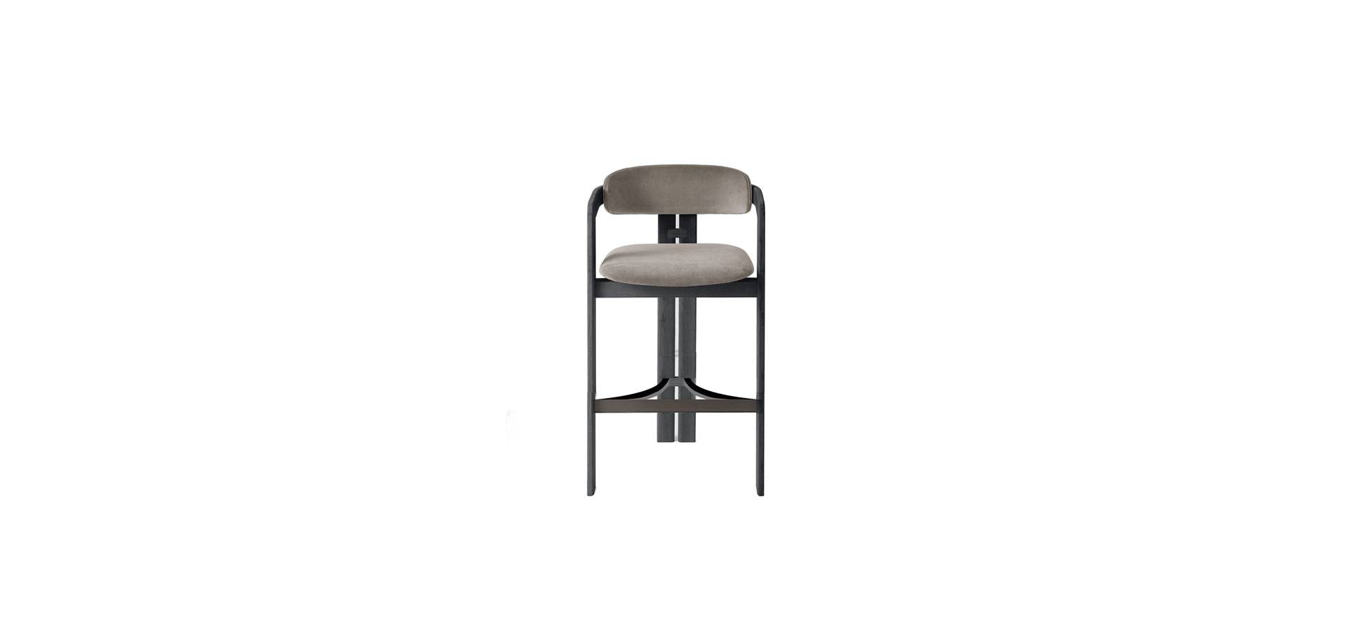 Stool has a robust curved ash construction and a black lacquered open pore finish. Natural ash, tobacco stained ash, and white open pore lacquered ash are also available. Seat and backrest with internal wood framework and by-products padded with non-deformable polyurethane foam polyurethane in various densities. Fabric or leather, depending on the samples. Cover is not detachable.