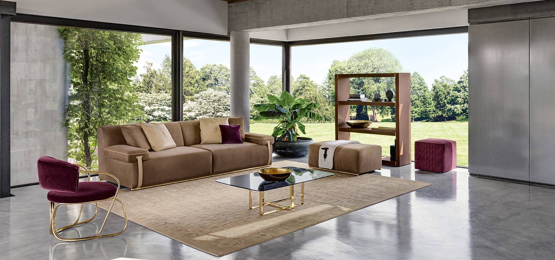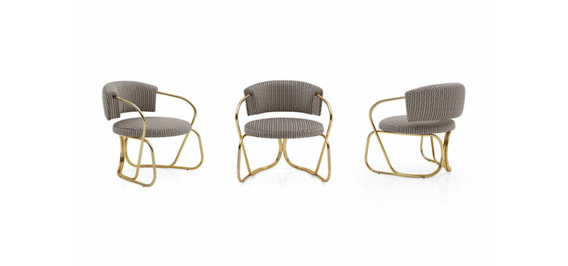 The innovative architectural structure of the A-Round armchair is created by a dynamic flow of tubular parts. The rounded rear is covered with fabric or leather with Oval Logo embroidery. Steel armrests and legs finished with gunmetal grey or polished brass.