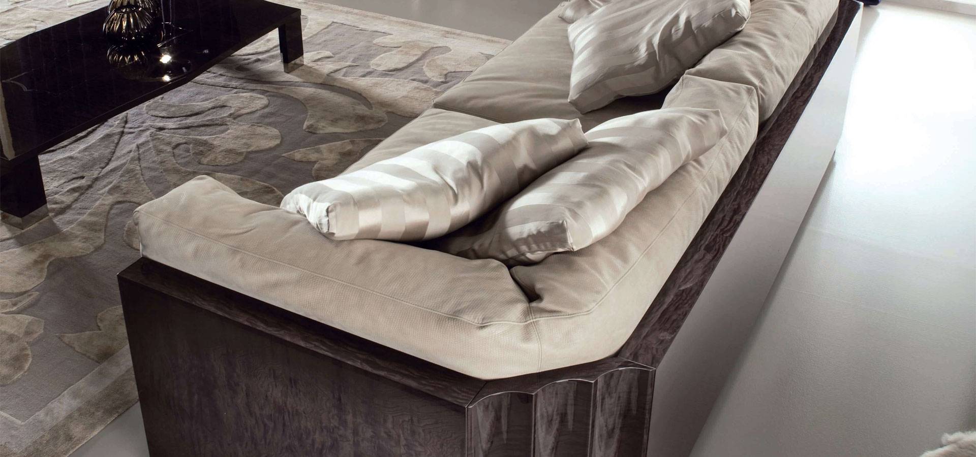 Fixed couch in high gloss polyester finish with moka japanese tamo burl veneer.