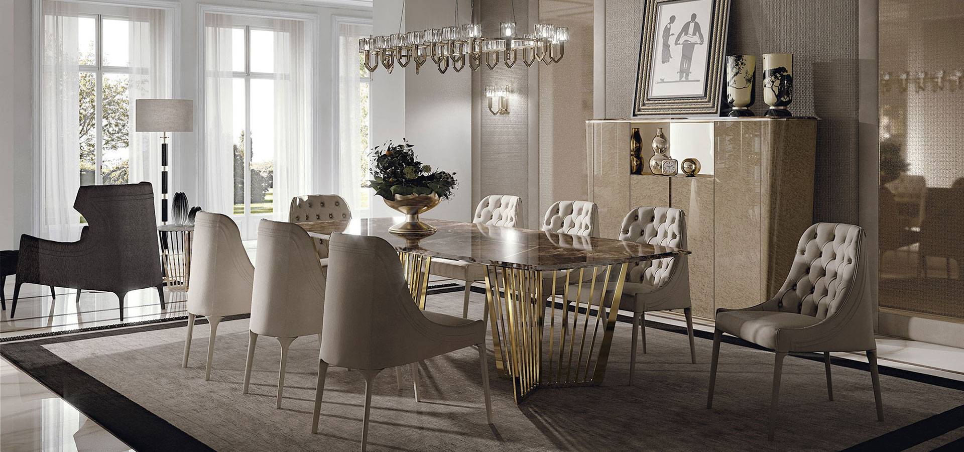 The contradiction of lightness and solidity is realized in the Alfieri table. A vertical pattern distinguishes this metal foundation, which alternates between solids and voids. Marble, a valuable and refined material, is used for the top, which comes in a variety of sizes. The inlay on the top, which mirrors the lines of the base for a visual illusion of continuity, creates an unexpected final appearance. The Alfieri table, in all its glory, adds an exquisite and refined touch to any setting.