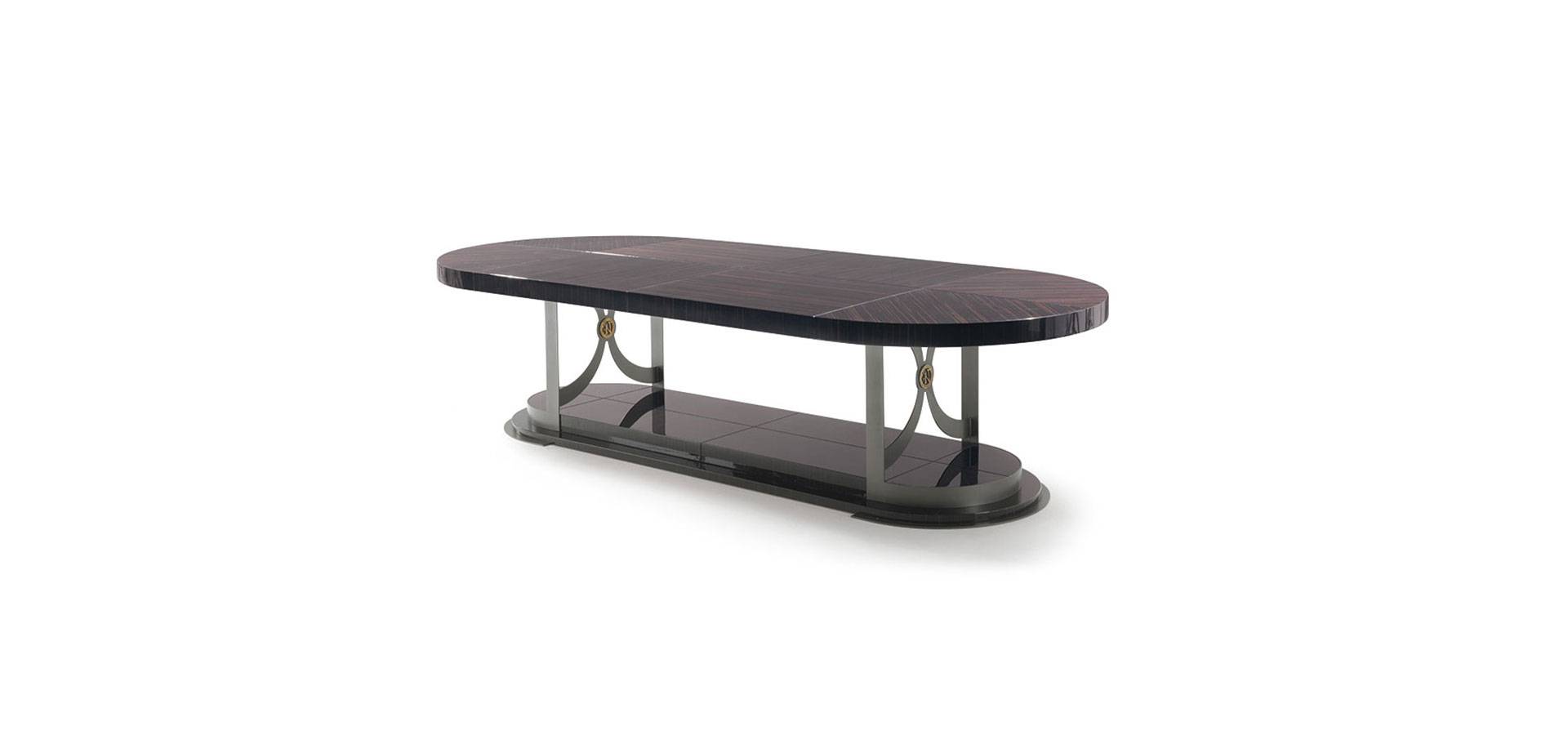 The Aragona table, with its wooden top and base, plays with proportions and geometries in a wonderfully balanced contrast, as seen in the rounded top shapes, which emphasize the geometric inlays even more. Metal legs in the Vittoria Frigerio collection's rich finishes accentuate a play of shapes that reflect the top. The VF logo in the middle of the legs underlines the table's uniqueness and proportions.