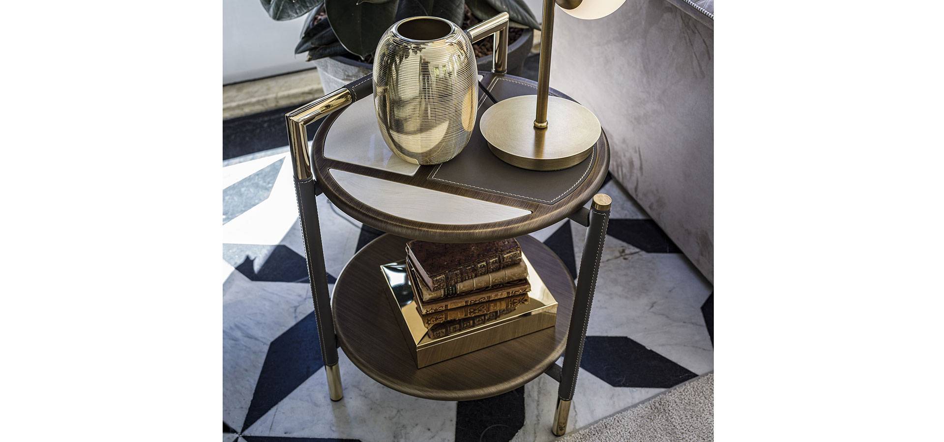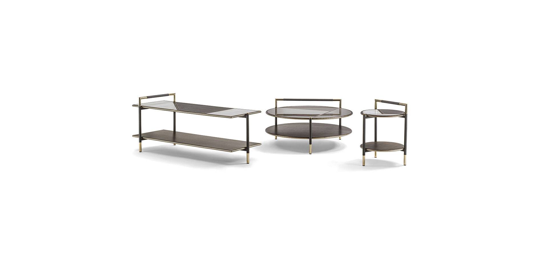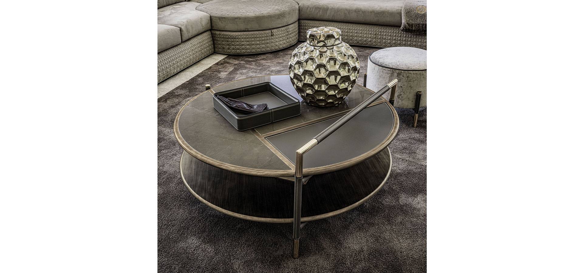 The harmony of materials, textures, and colors is the product of meticulous research and the capacity to dare while keeping loyal to oneself. The Araldo coffee table family offers a variety of bright and cheerful furnishing options without sacrificing quality, improving finishes and features distinctive of the Vittoria Frigerio collection and embellishing every detail. The top and lower shelves have bronze patinated wood profiles, and the top has porcelain stoneware inserts with marble and leather effects, the latter repeated on the framework and details in gold chrome. Various materials combine for a refined finish in shapes that add simple elegance to any space.