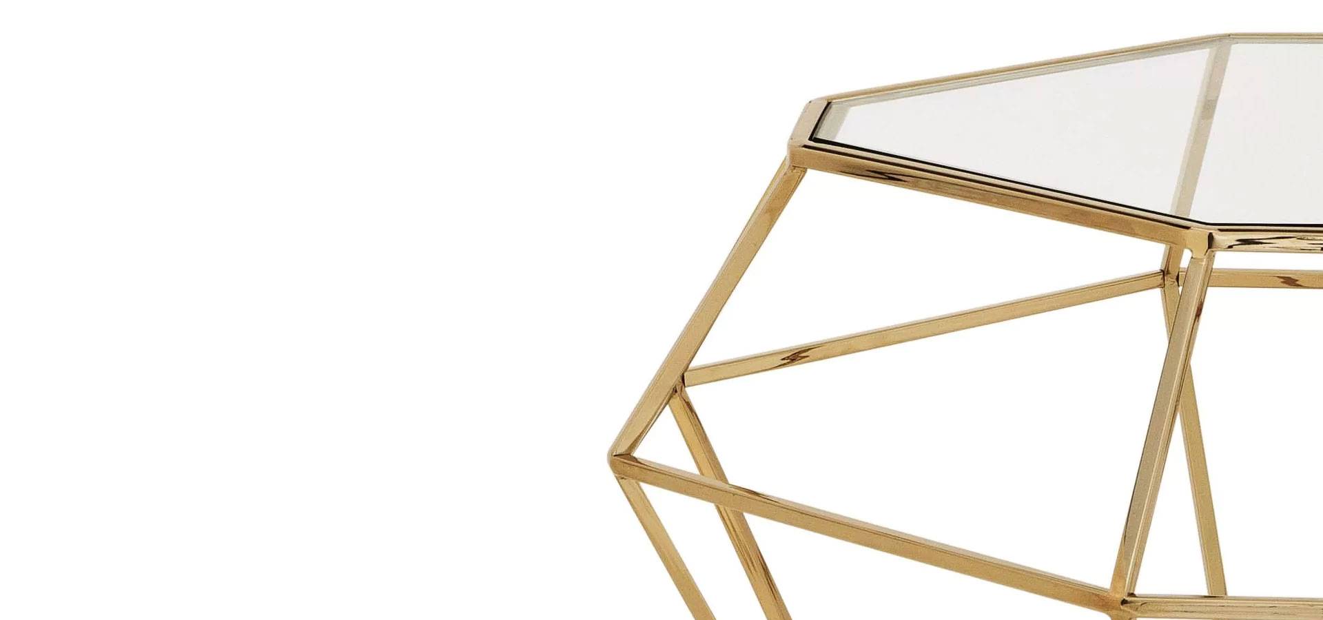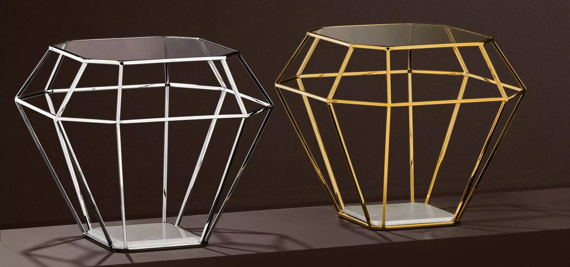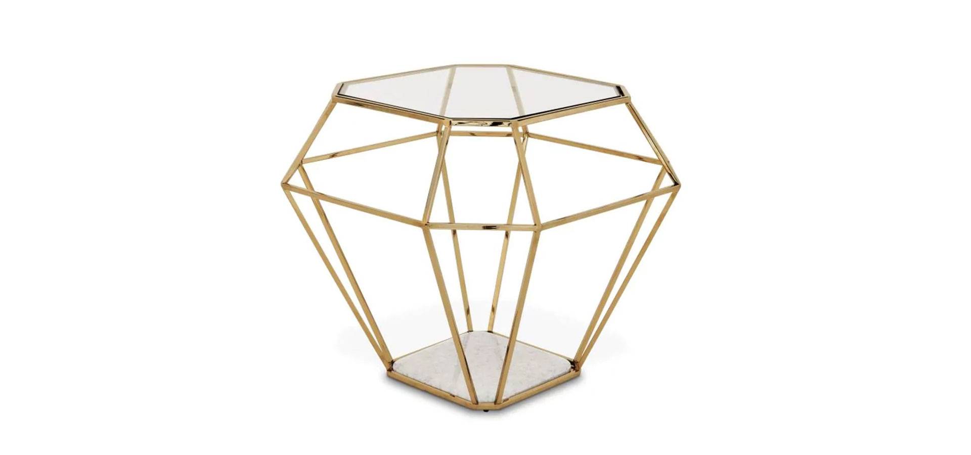 The gold finished wire frame of the Asscher Side Table resembles the outlines of a faceted diamond. It rests on a beautiful white marble base and features a clear glass tabletop.