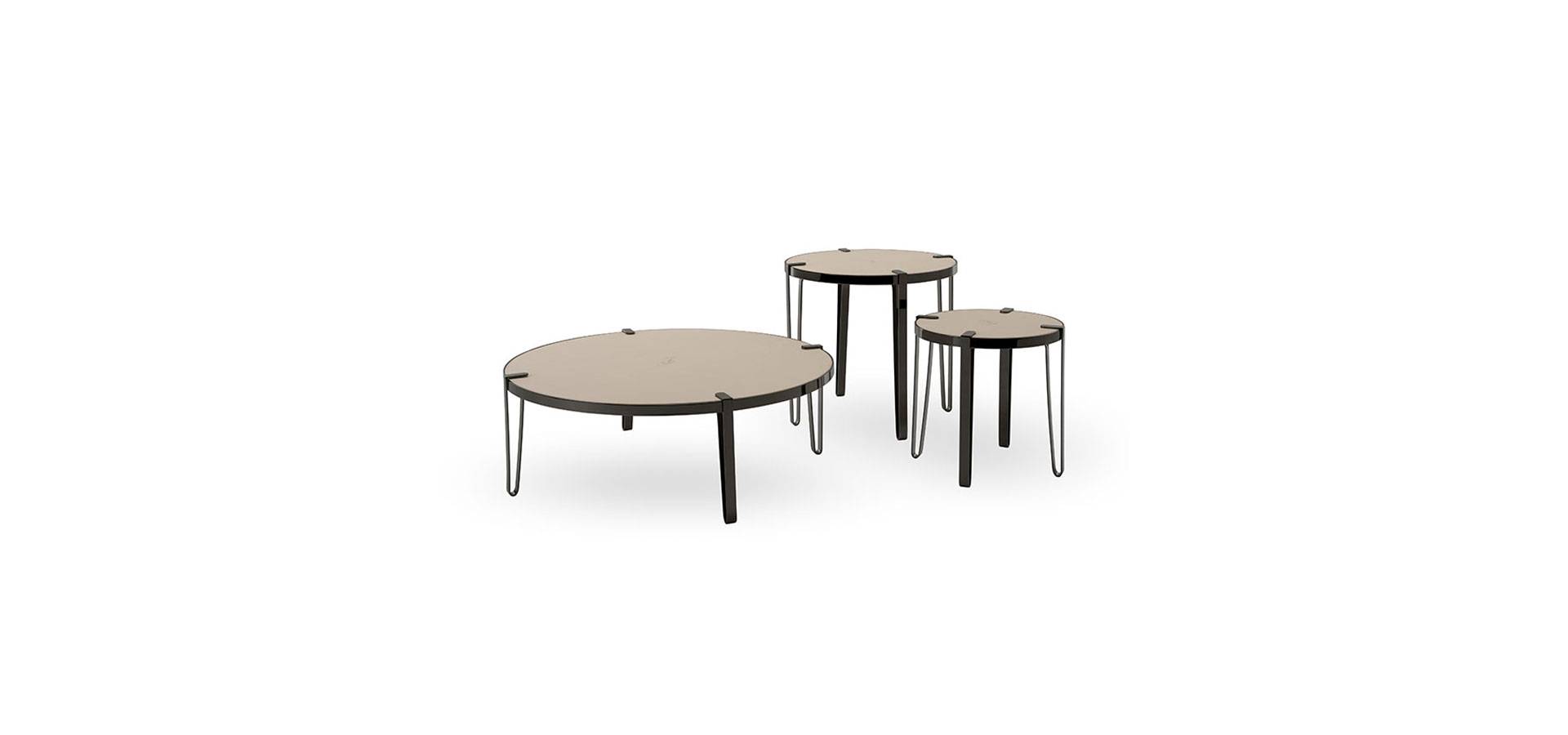 The Bondai coffee and side tables are simple in design, with a steel frame finished in gunmetal grey and a wood top covered in leather with a printed Oval Logo.