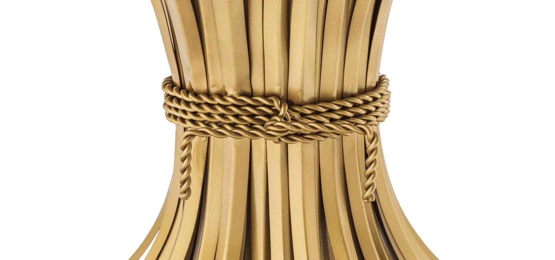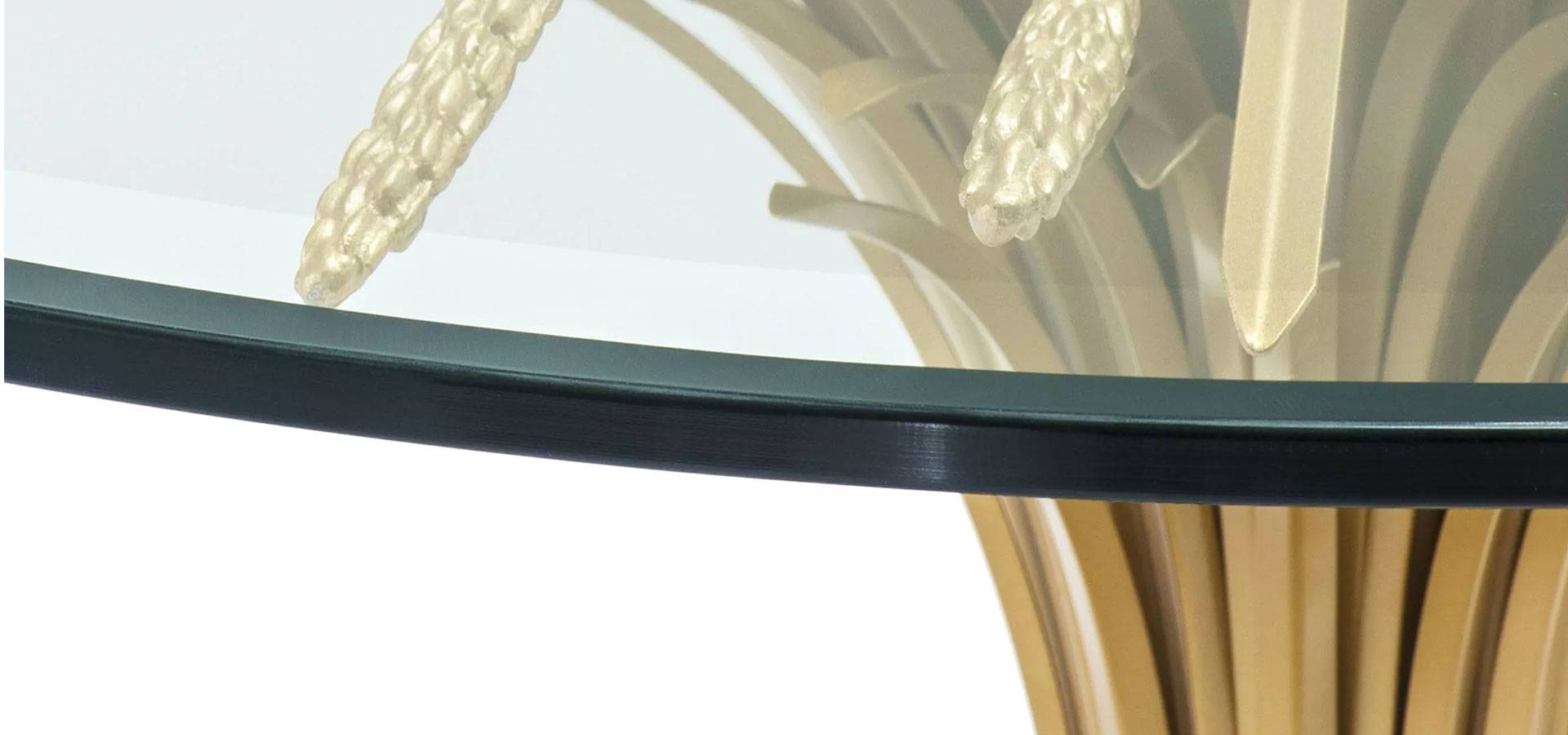 Sculpted from iron in an antique gold finish, the dazzling Bonheur Table includes a sheaf-shaped base and a bevelled clear glass tabletop. Originally a symbol of prosperity and hospitality, the sheaf signifies one has worked hard and is now enjoying the good life.