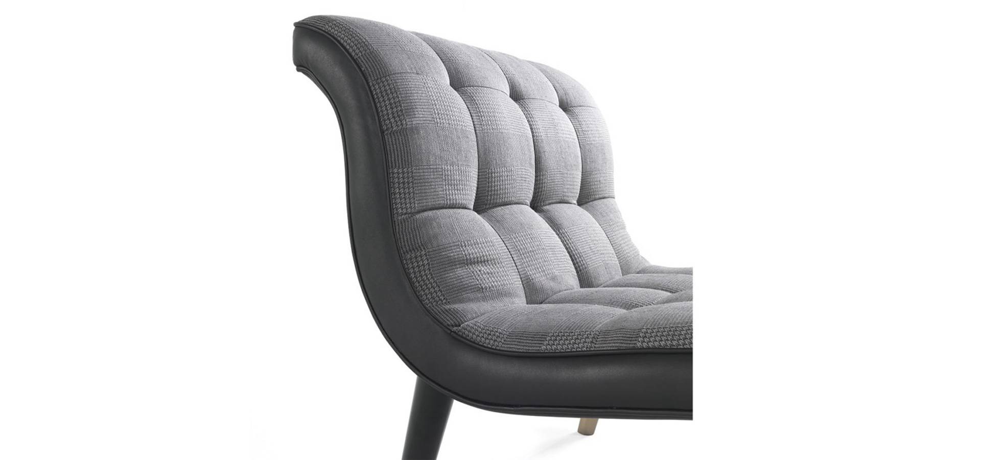 Bonnie has a unique shape that is halfway between an armchair and a chaise longue, with the back continuing on the seat and capitonné manufacturing on the entire frontal part. The Bonnie armchair is sophisticated and extravagant, with sloping back legs and bronzed brass tips that add a vintage touch to the overall look.