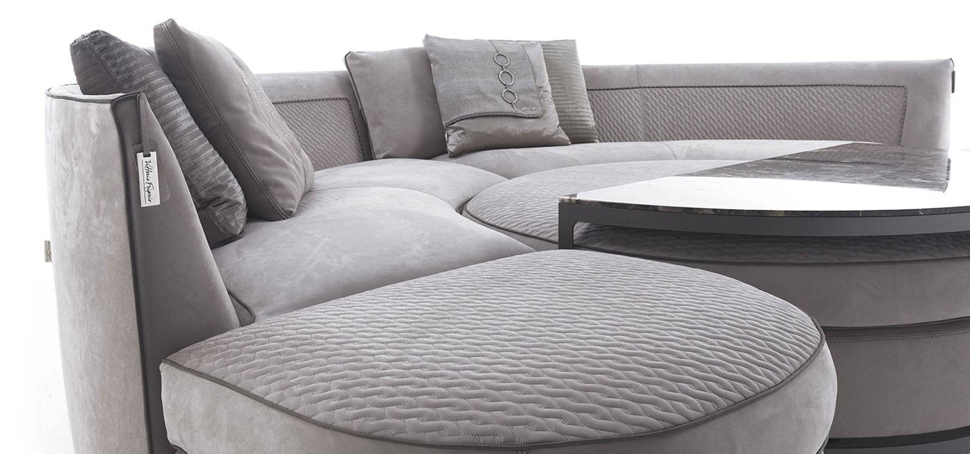 The Borromeo sofa is distinguished by its classic and contemporary taste, modern proportions, and exquisite and sumptuous elegance. The collection is divided into linear solutions with closed or modular couches, conventional corner solutions, and the iconic version with curved corner, round pouf, and matching semicircle-shaped coffee table. The devoted quilting inside the backrest and replicated on the surface of the poufs completed with a contrasting hand-stitched profile, while the rest of the sofa is finished with a polished smooth profile, is the collection's unifying element. A series of accessories, such as semi-circular coffee tables and island poufs with inserts in wood or marble-effect porcelain stoneware, round out the set.