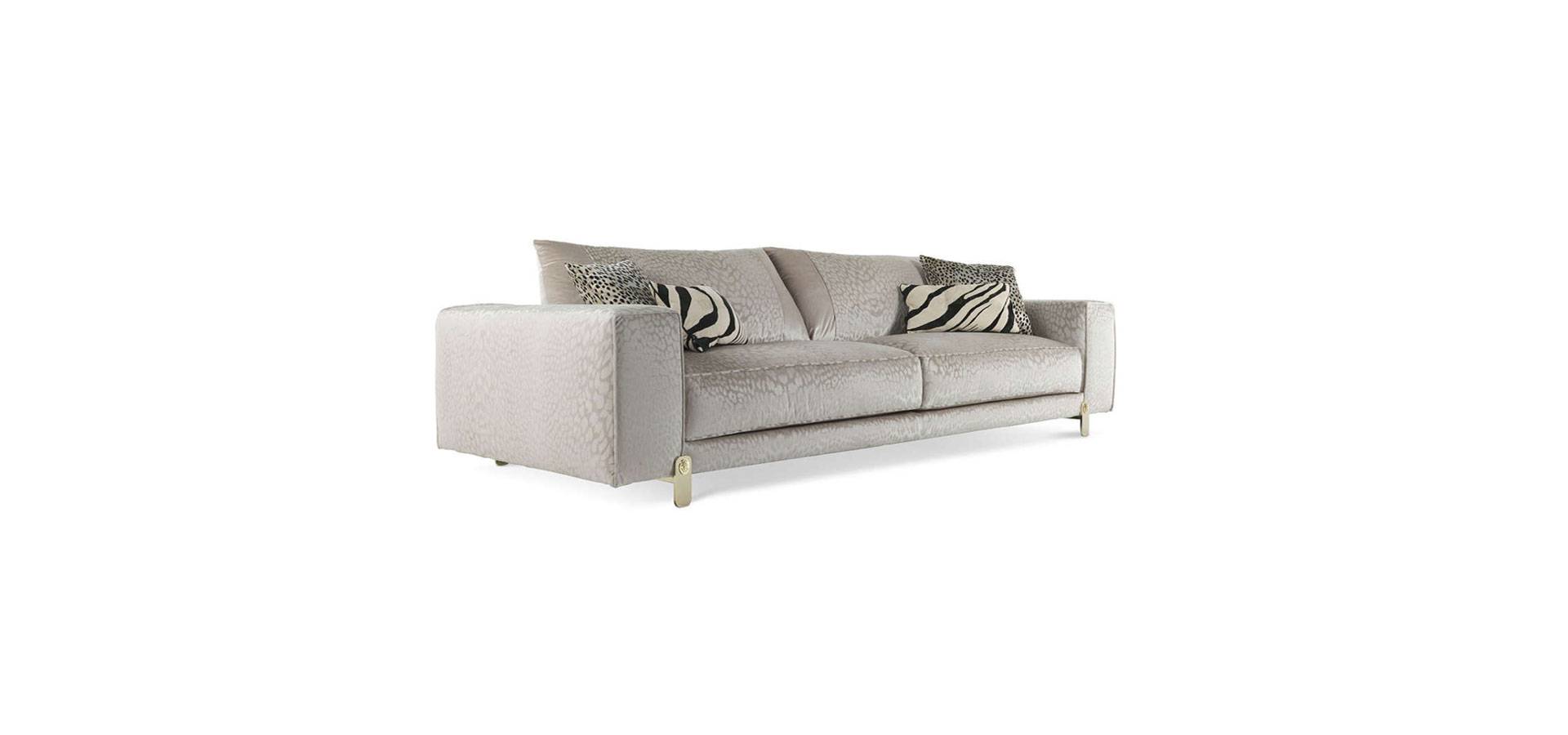 The straightforward, linear forms of the Caicos sofa are given a brazen, sensual charm. The collection's leather or fabric upholstery, which features recognizable Maison patterns like the animalier designs, combines with the shine of metal feet with the Roberto Cavalli insignia to provide a look that is unmistakably glam-chic.