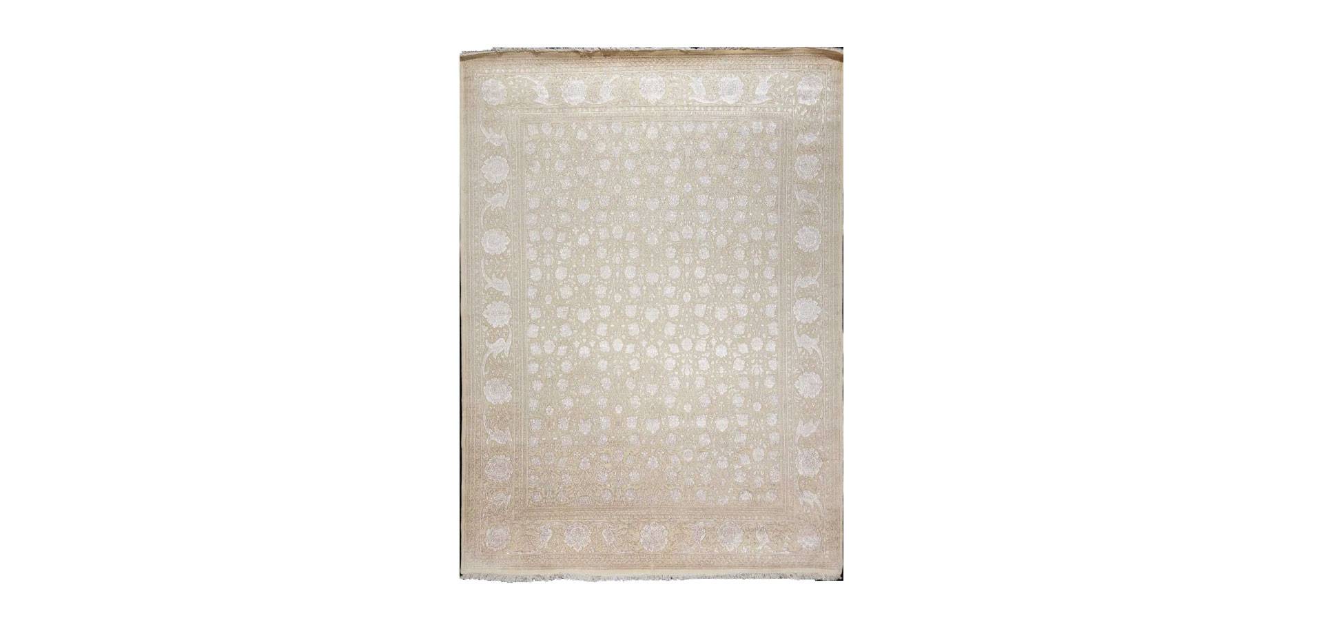 Handmade carpet, modern, Indian, wool with bamboo silk, high density and thick pile, excellent quality. On a beige background with white embossed patterns, this abstract design is unique. Too much silk in a too bright carpet. It changes color depending on how you look at it! From our company's exclusivities!