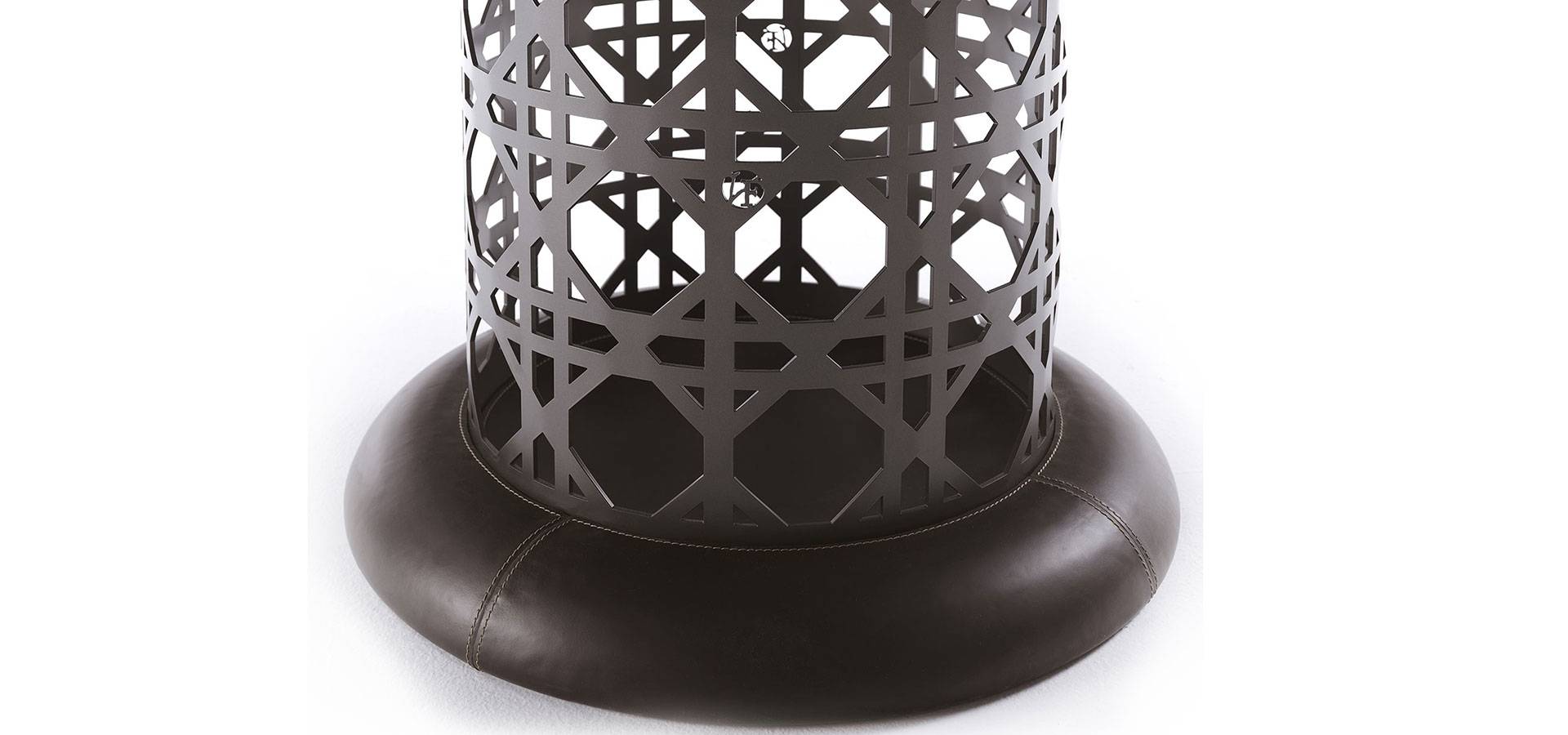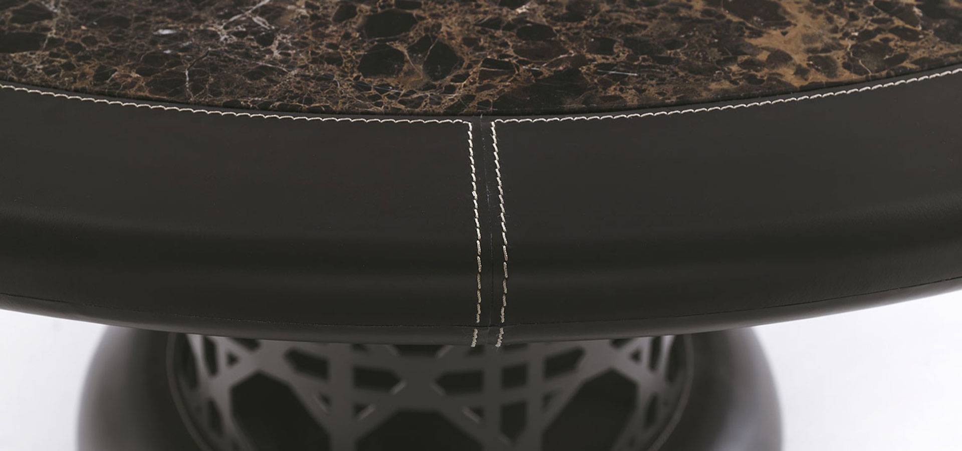 The Crespi dining table set features two bases: the METAL version features a geometric pattern in painted metal in the VF collection's colors, and the HIDE version features a leg and base on the ground wrapped in leather with contrasting stitching. The marble or marble-effect porcelain stoneware top is encompassed by a leather-covered wooden profile with contrasting stitching, emphasizing the Vittoria Frigerio collection's sartorial ability. The table's Lazy Susan top is made of the same material as the top.