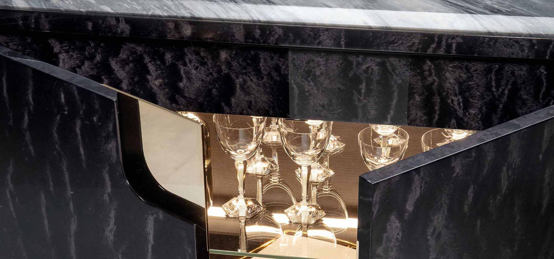 Black Bubinga burl veneer buffet with four doors and a high gloss polyester finish. Beveled marble top, bright gold chrome stainless steel handles and details