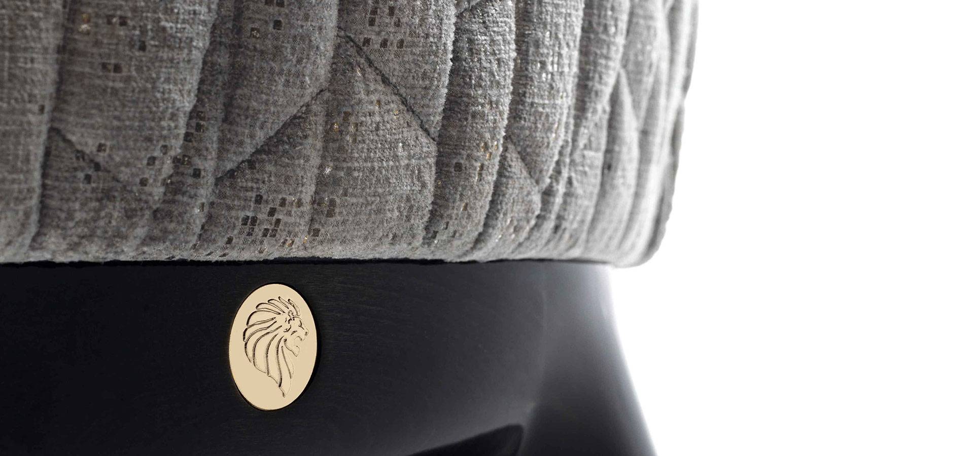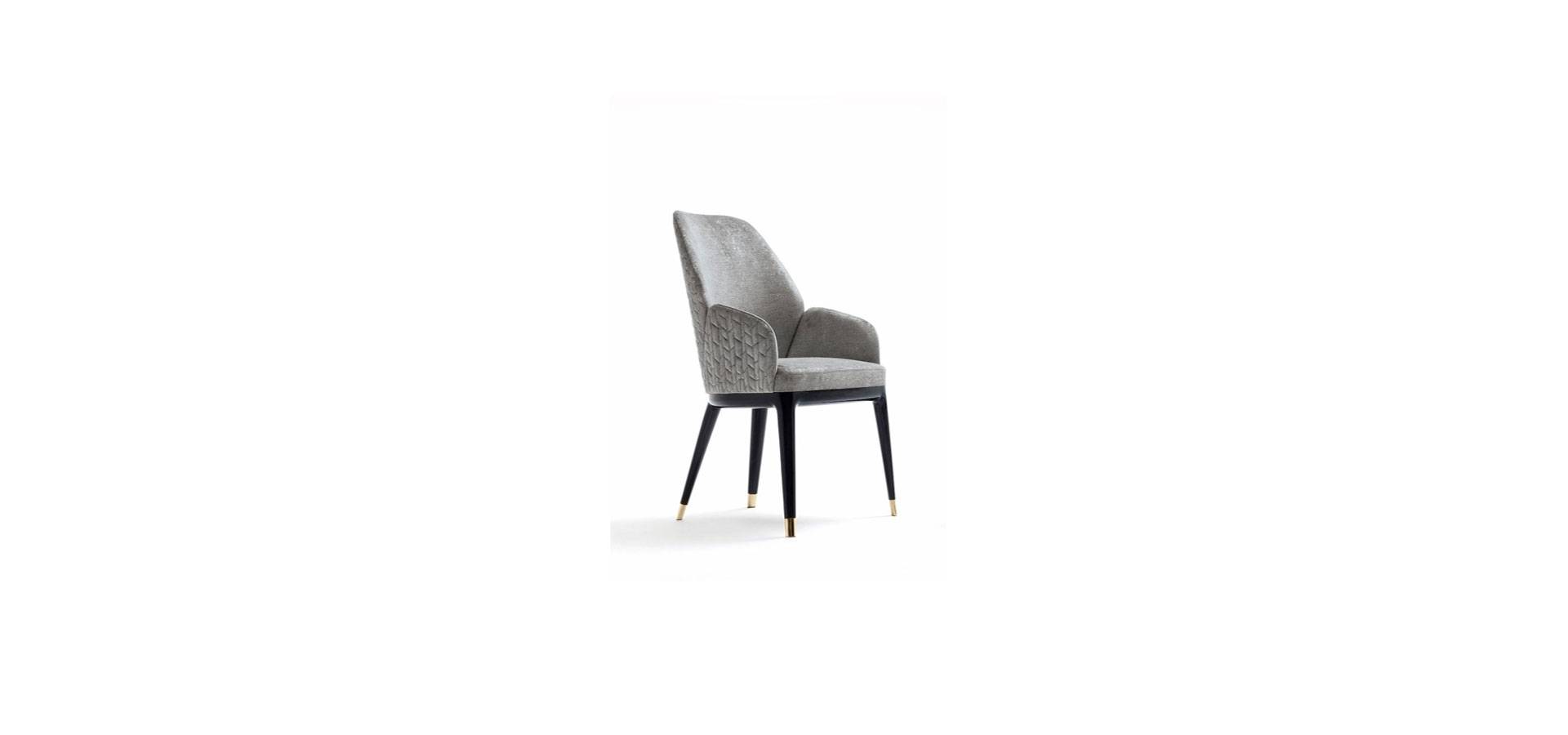 Solid beech side armchair with upholstering. 4 legs with gold chrome stainless steel embellishments. Giorgio Collection metal logo on a wooden base.