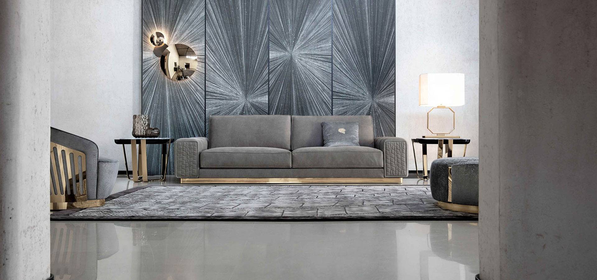 Special stitching in polyurethane foam wrapped in down feather on sofa seats and sides. Armrests for the sofa with a quilted finish. Stainless steel base and armrest metal trim in light gold chrome.