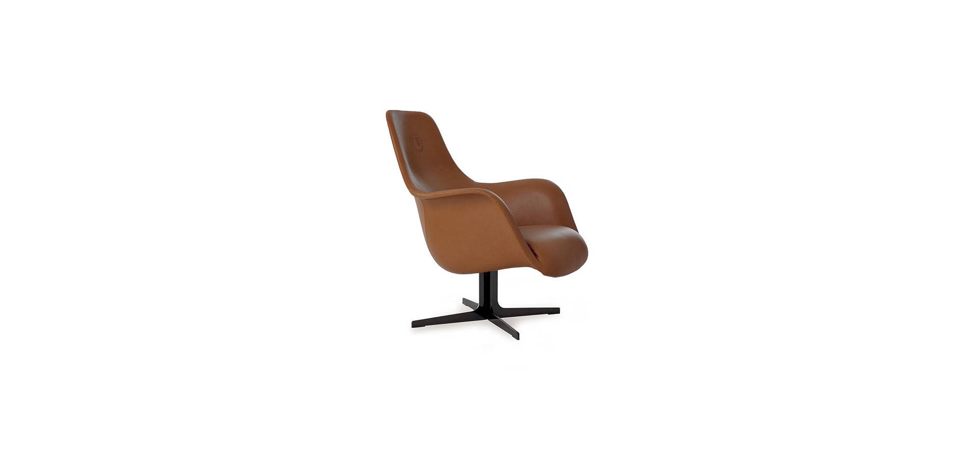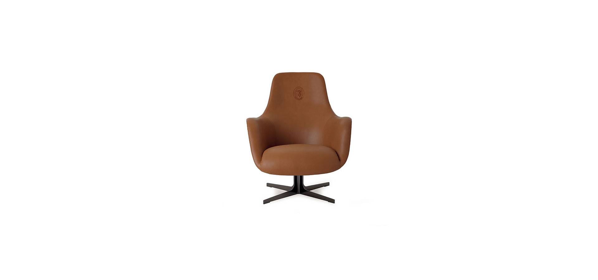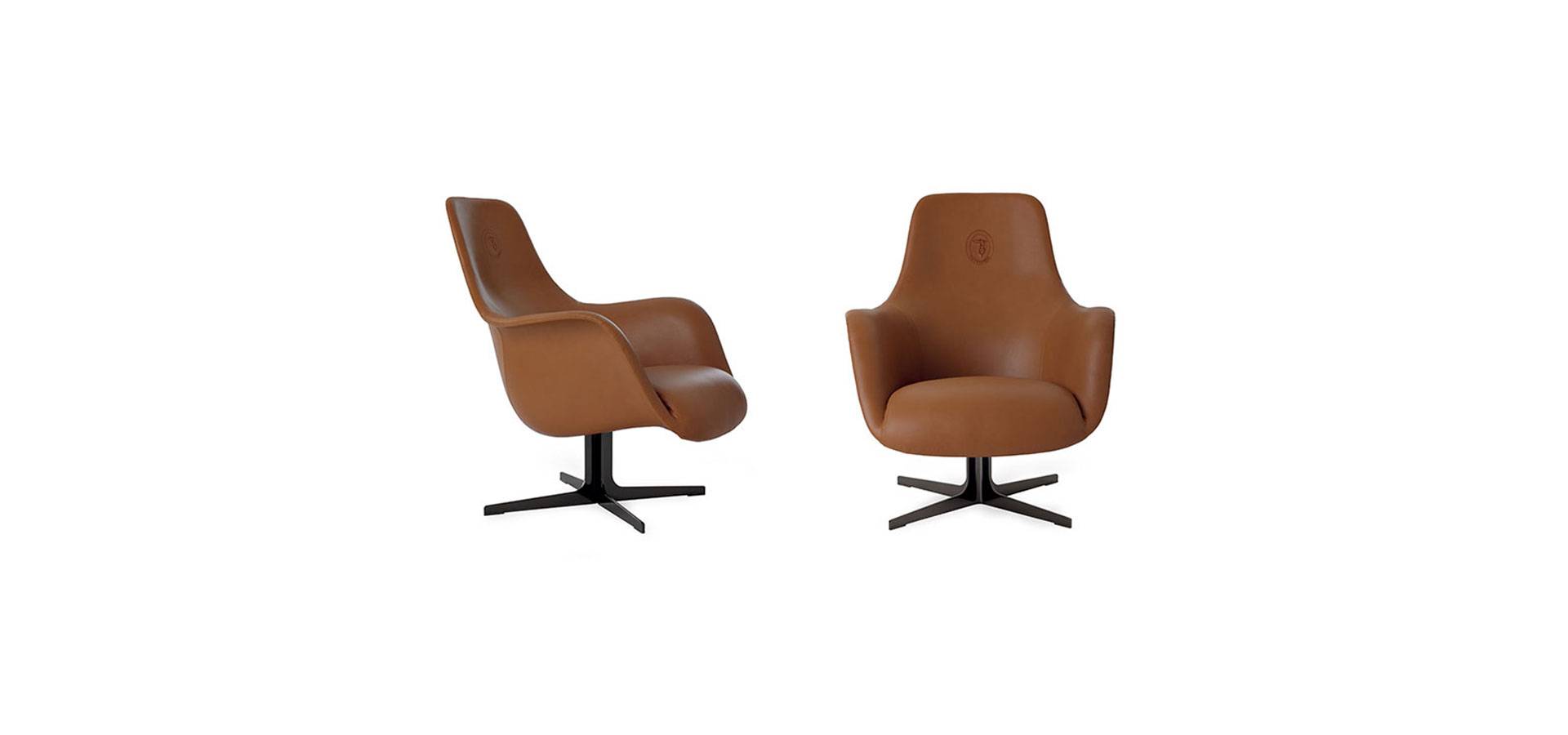 CipCip armchair is eclectic and humorous, with a characteristic curving form upholstered in fabric or leather and an Oval Logo embroidered on the back. Steel base with gunmetal grey or Silk varnish bronze finish.