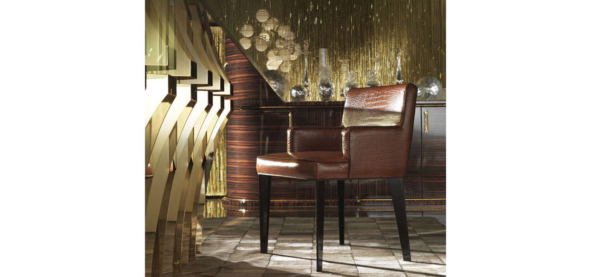 Wood and foam structure with multiple layers. Upholstery from the range in fabric or leather. Metal legs are available in all of the collection's finishes or lacquered to match. Quilted leather hexagons are one option.