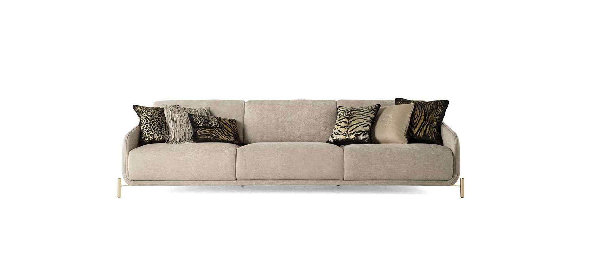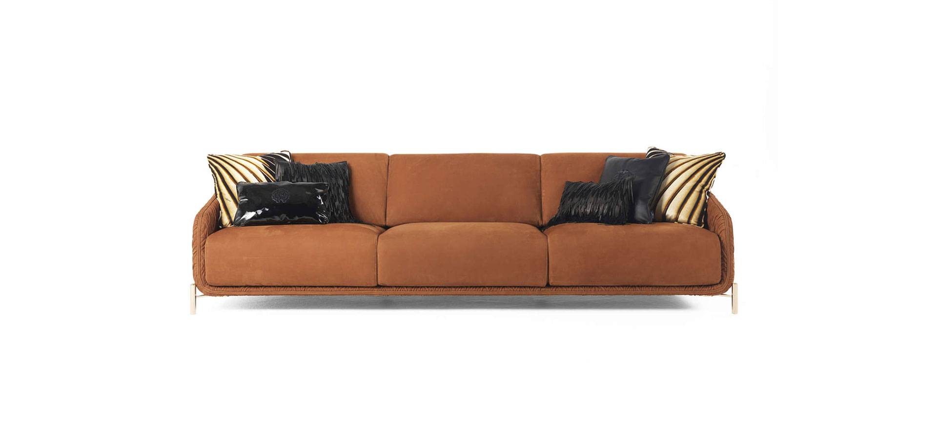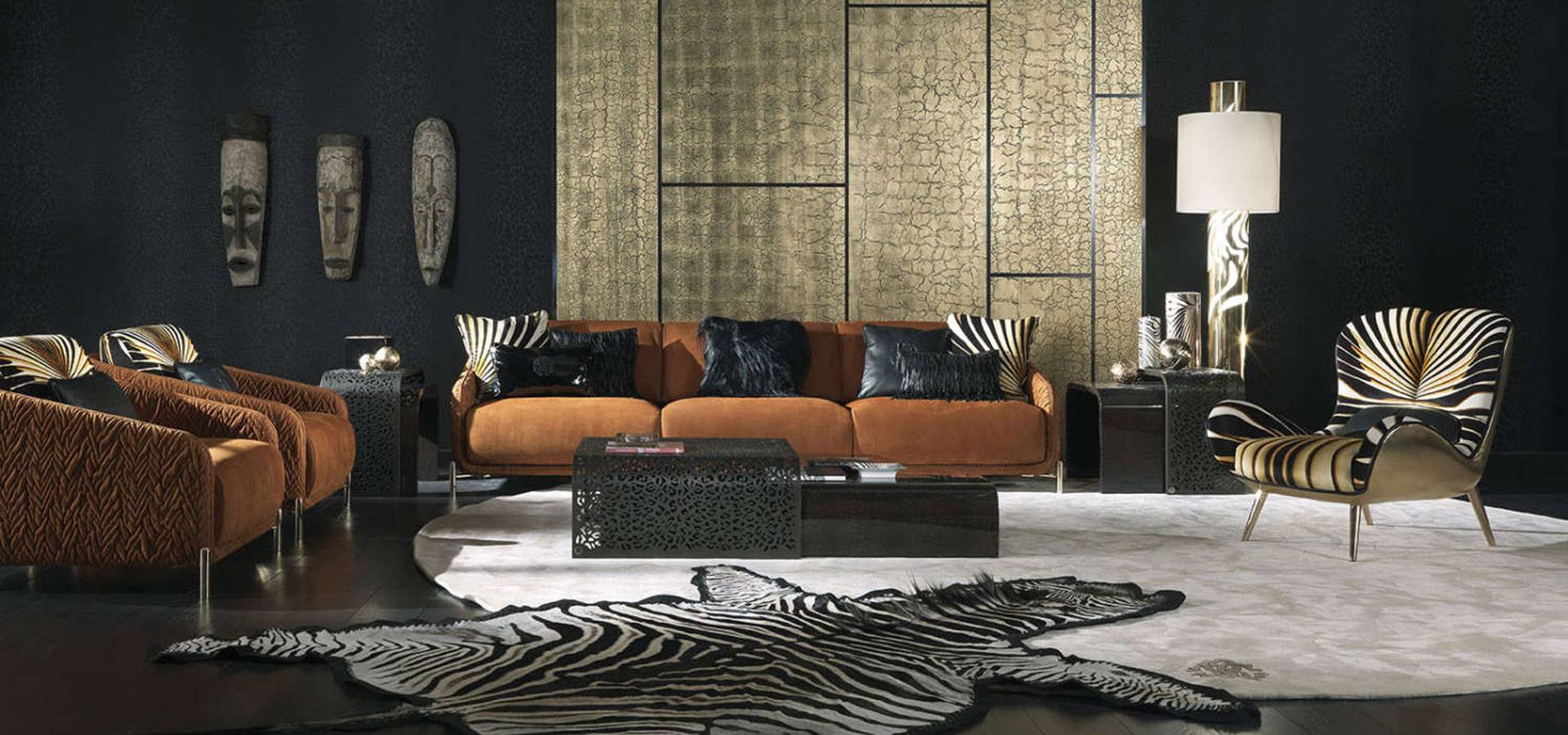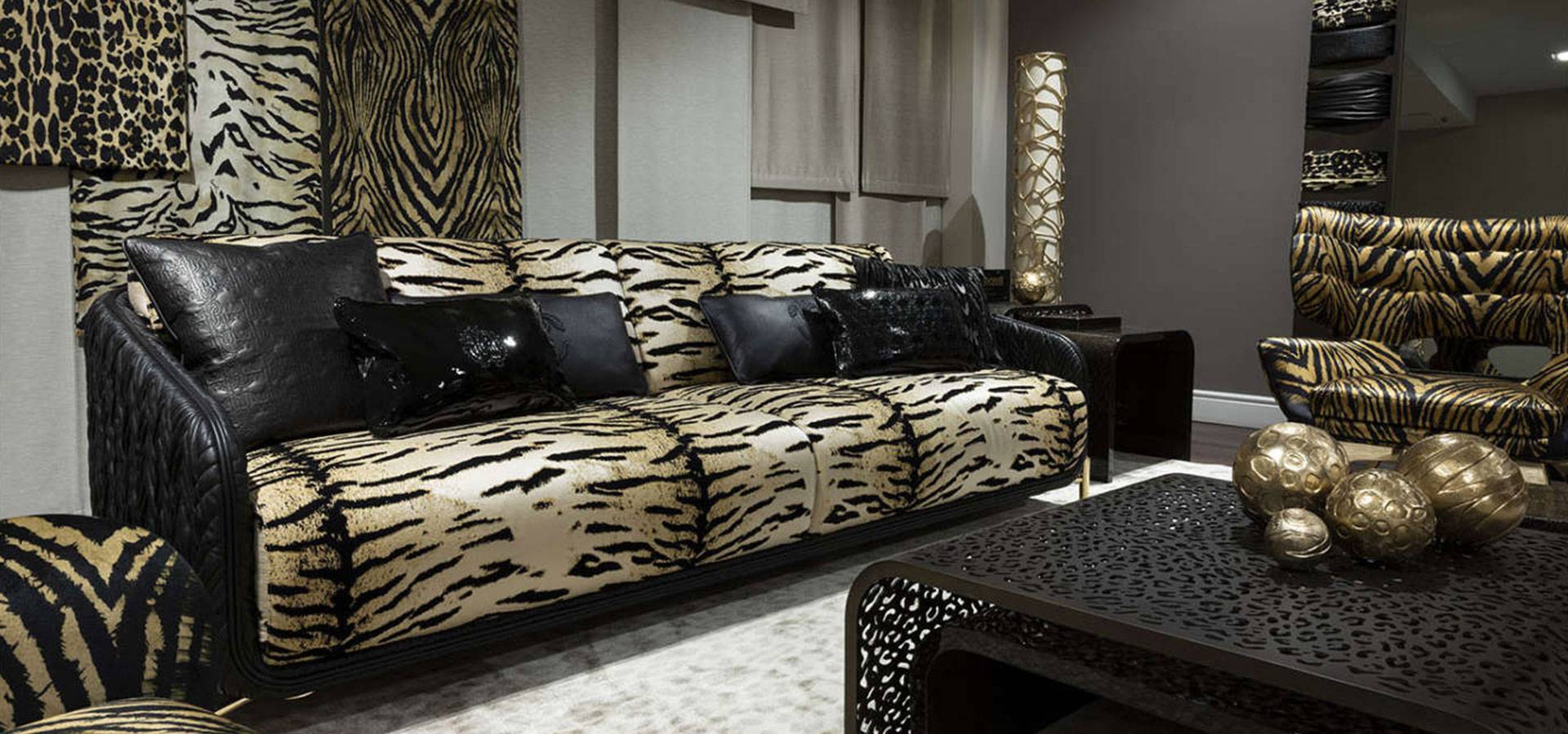 A one-of-a-kind, sensual sofa that perfectly expresses the brand's authentic spirit. The sofa is enhanced with animalier designs, which wink to Roberto Cavalli Home Interiors' most wild character. It is upholstered in a new textured and luscious Cocco leather.