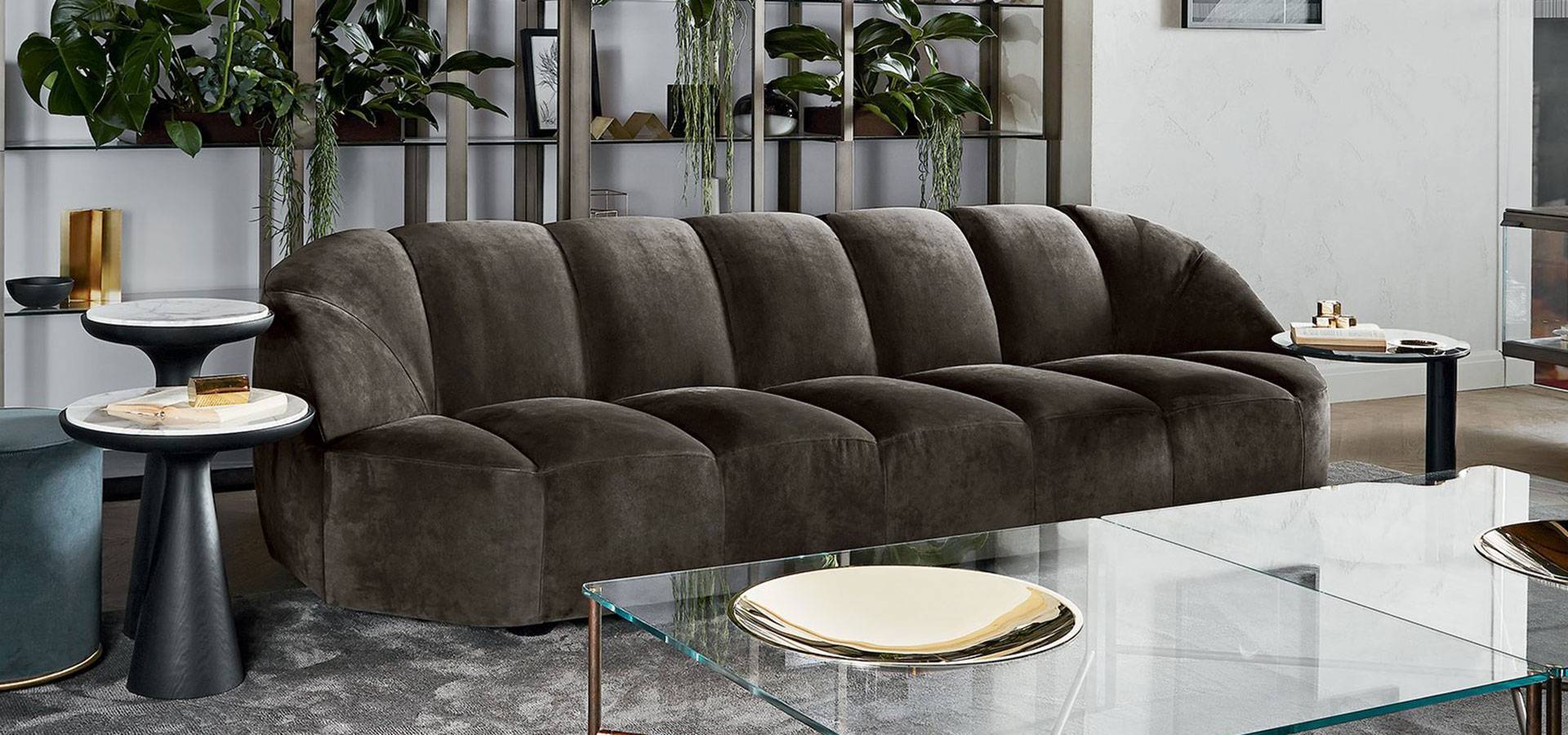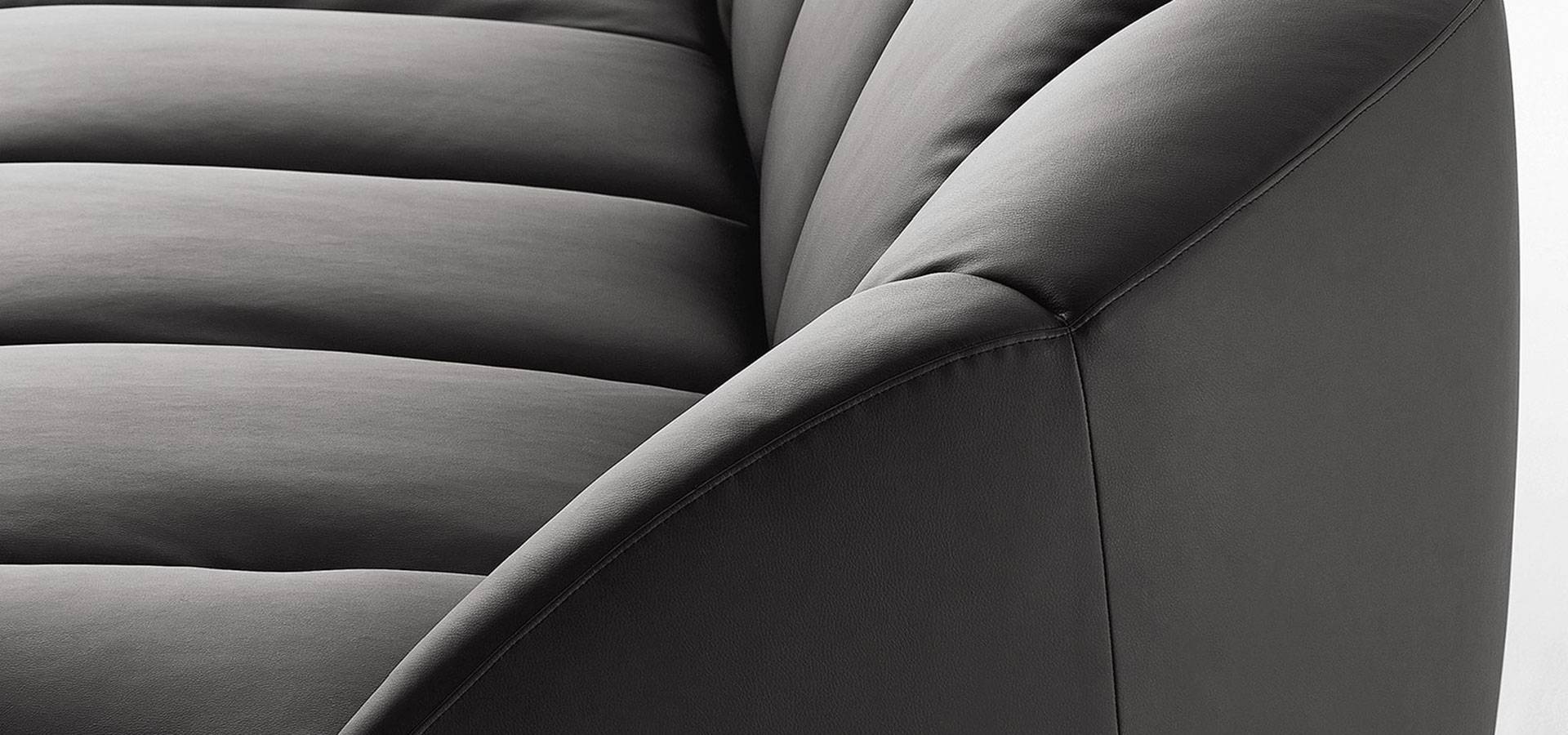 Sofa with internal structure made of wood and by-products and non-deformable polyurethane foam of various densities and polyester fiber. MDF mass base in black. There are two polyester fiber back cushions. Upholstery in the samples' hues is available in fabric or leather. On request, polyester fiber decorative cushions are available. Fabric cover can be removed if desired.