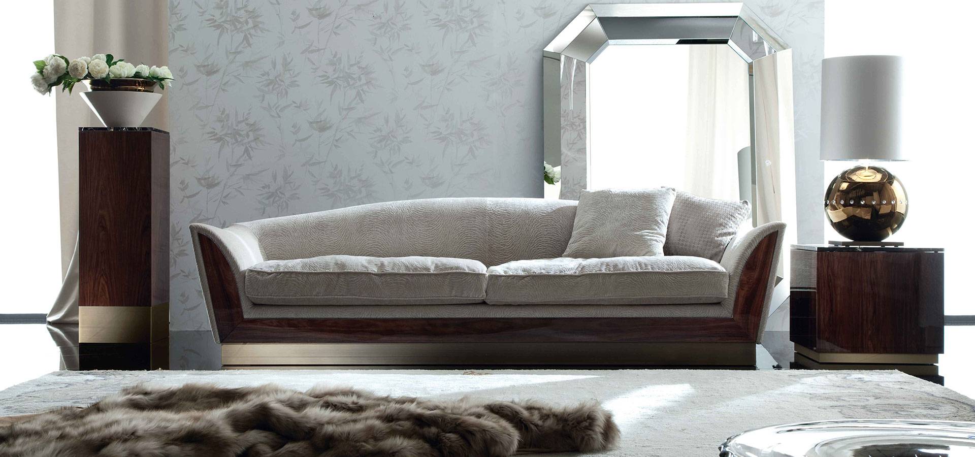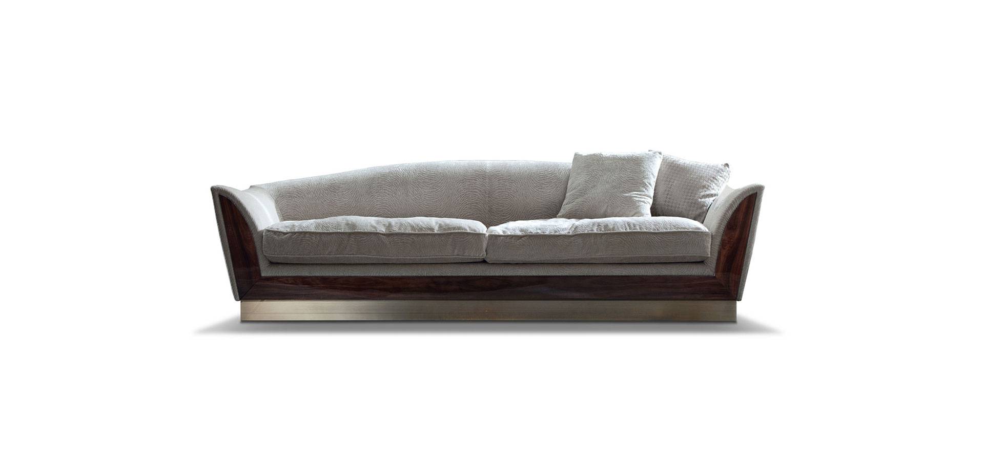 Fixed sofa with brazilian rosewood veneer front inserts in a high gloss polyester finish. 2 seats available 2 pillows Base in bronzed stainless steel.