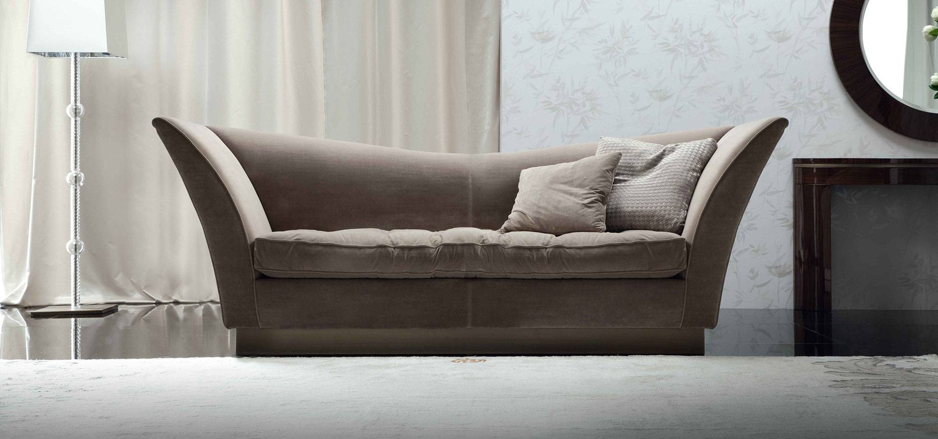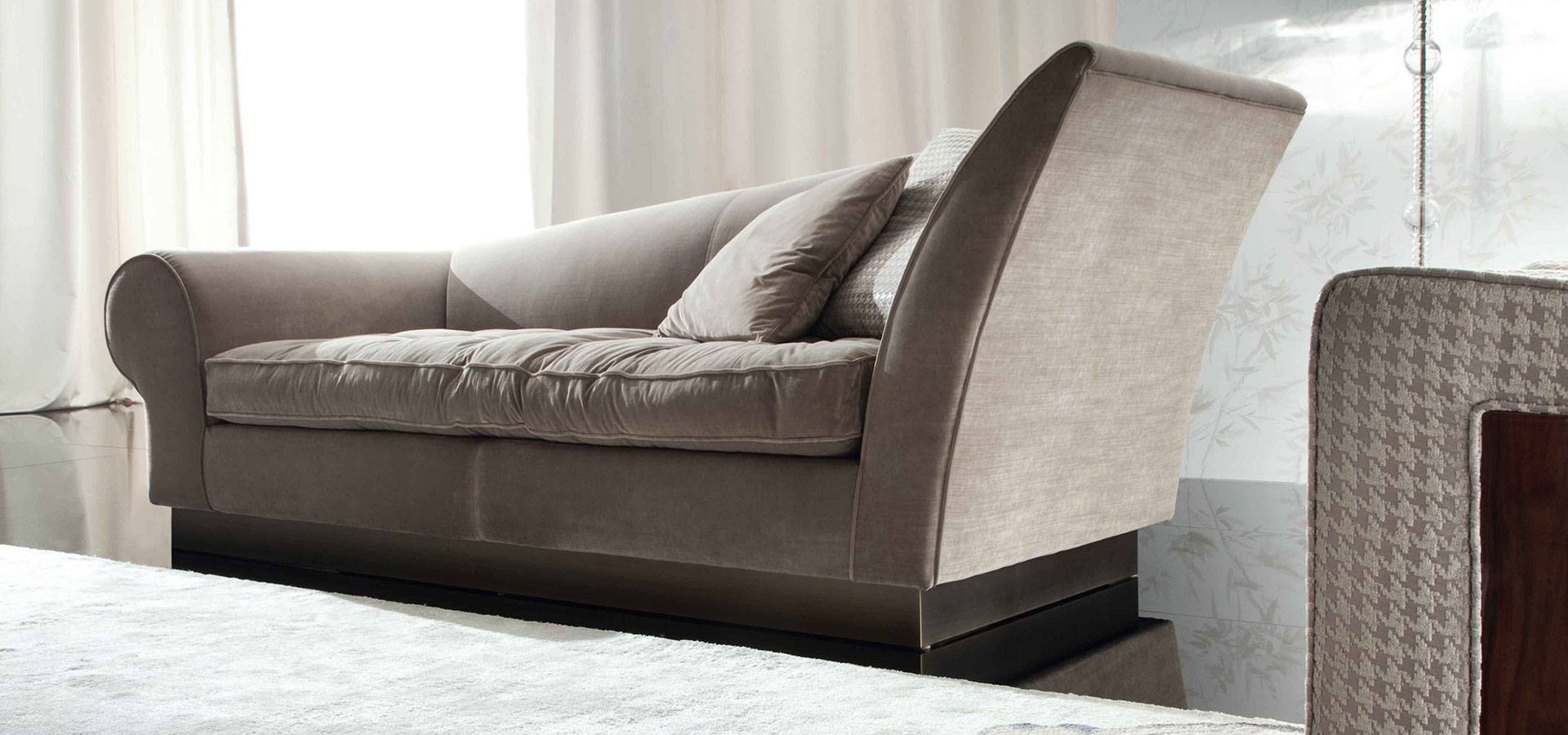 There are two seats and two throw pillows on this fixed sofa. Base is bronzed stainless steel.