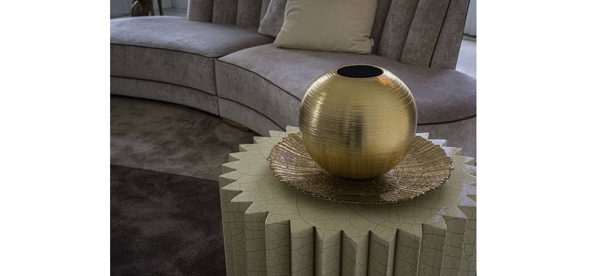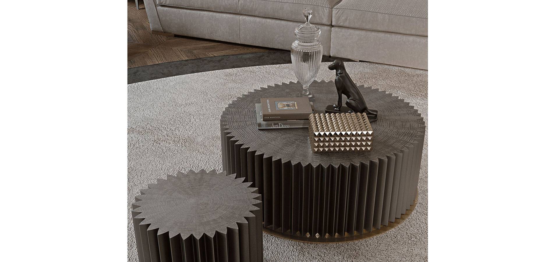 The circle's perfection in perimeter geometry is established by the processing of numerous acute angles to produce a starry effect. Except for the detail of the metal base on which the timber structure sits, the Colonna coffee table is a utilitarian, monolithic, and minimalist object. Every room needs a passe-partout.