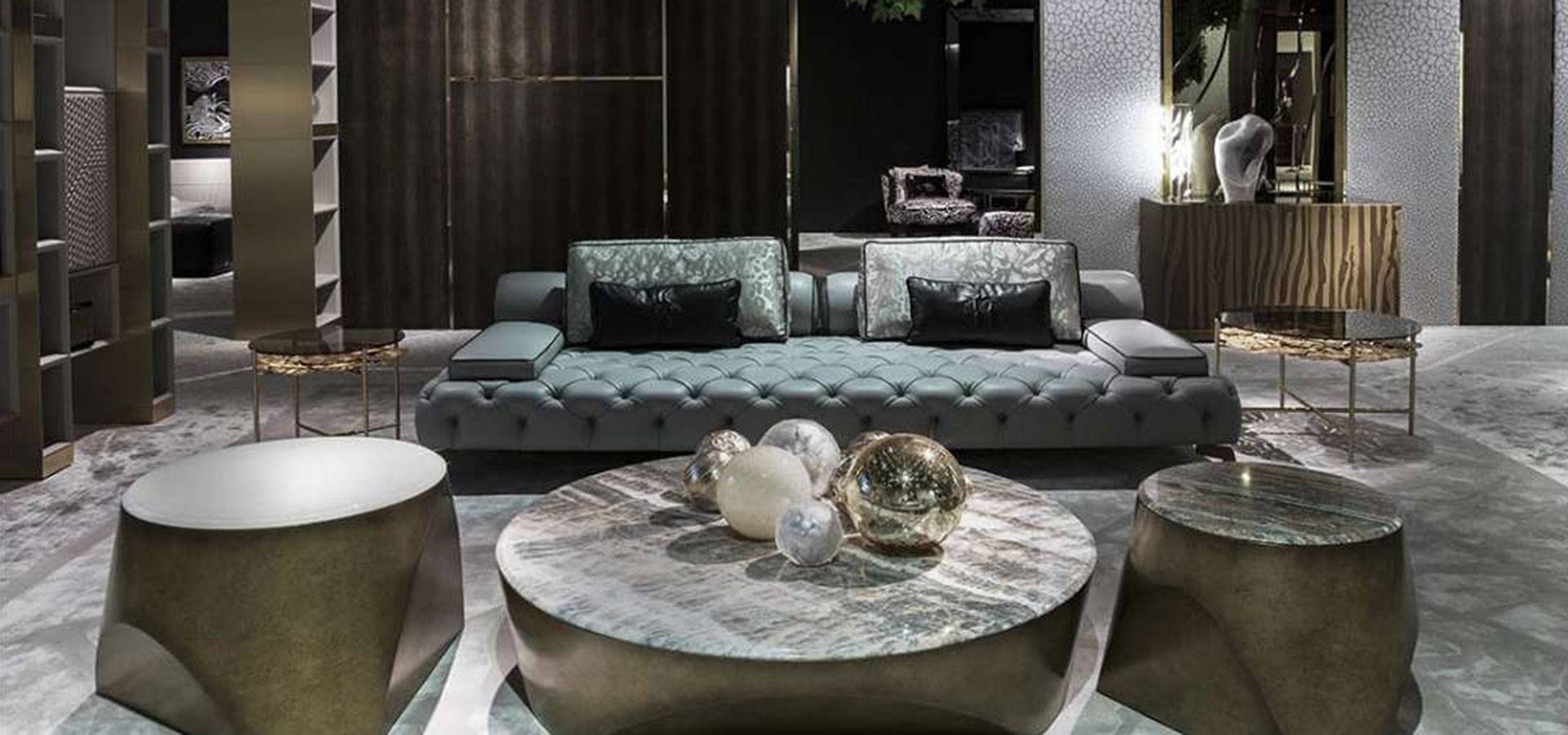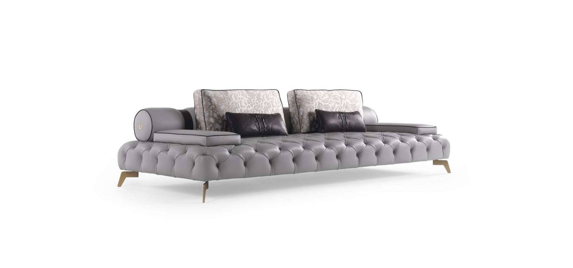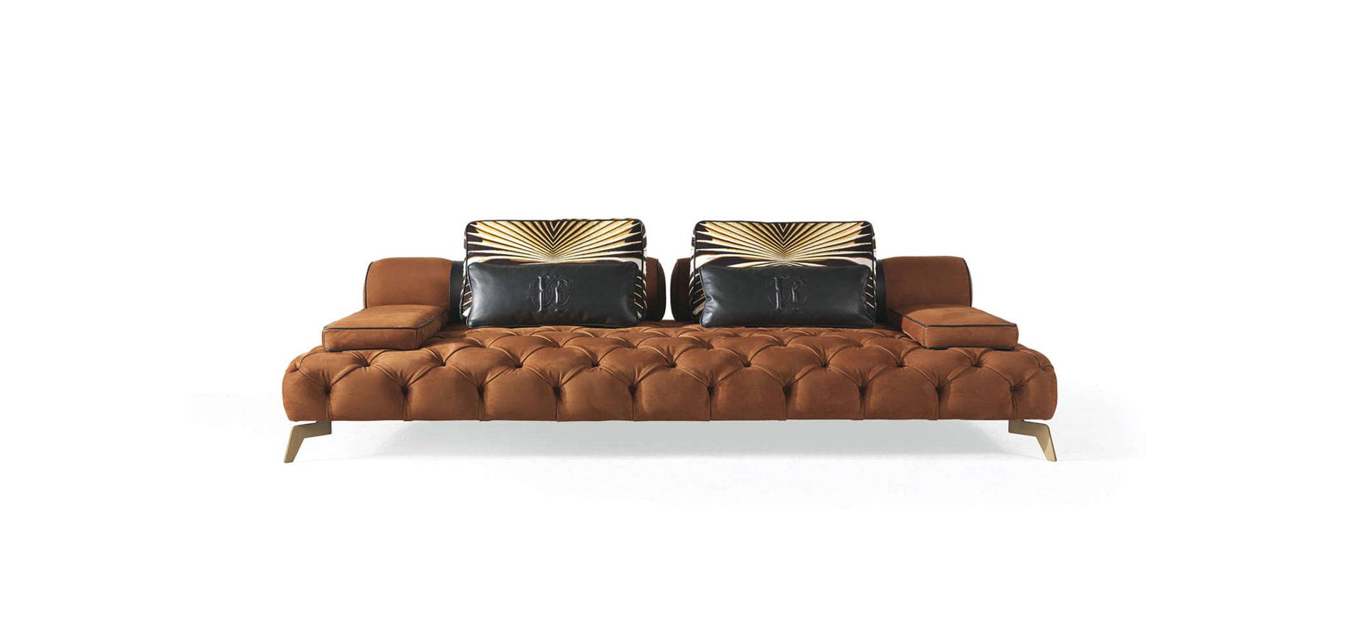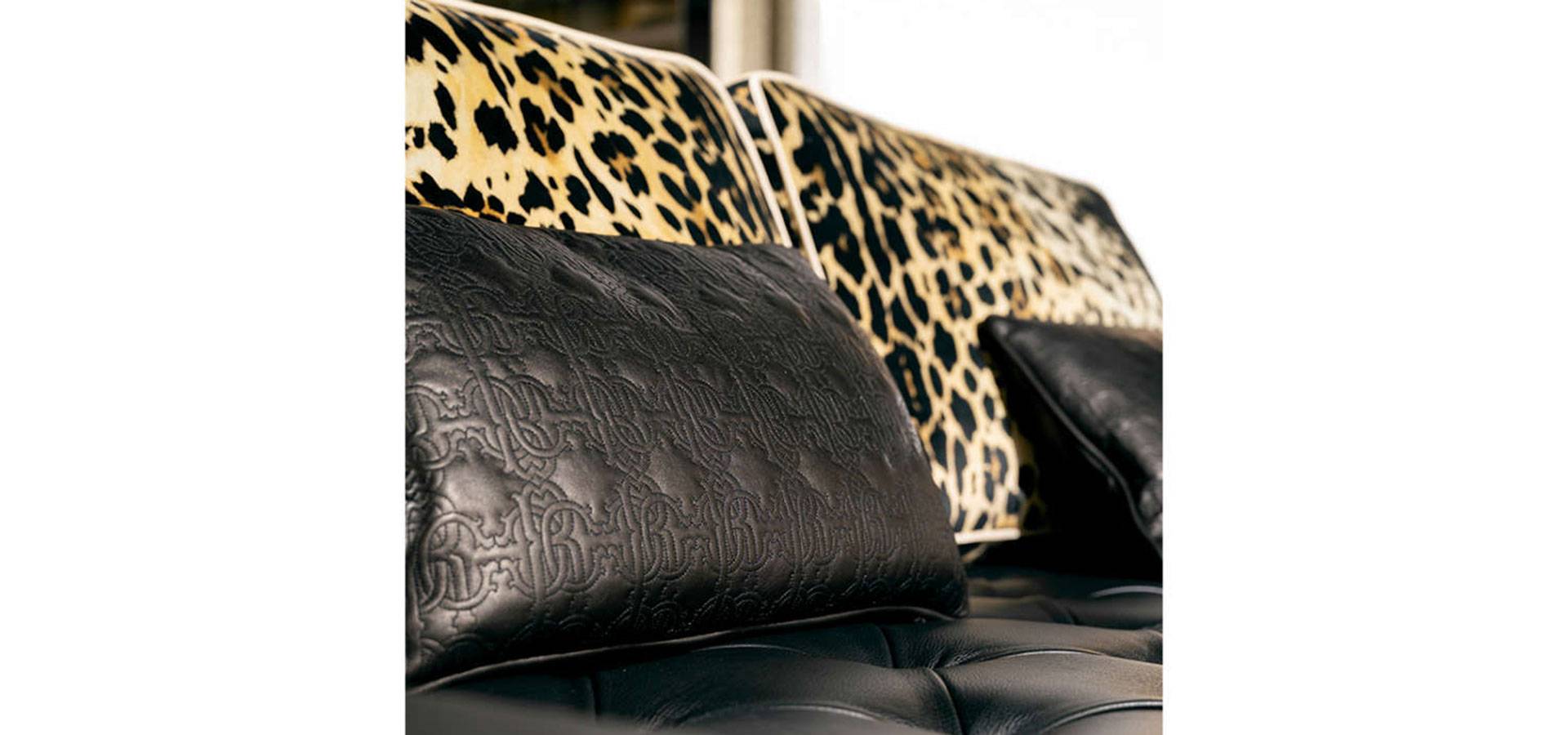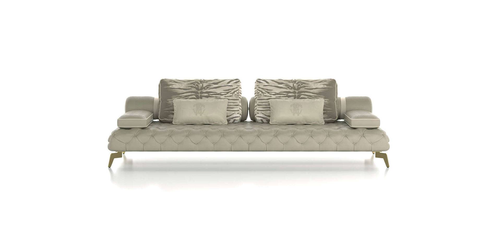 The Darlington sofa, a classic from the Roberto Cavalli Home Interiors collection, has a sophisticated capitonné finish. In the new design, the sofa has sand leather upholstery and cream nubuck piping. Wild Tiger-patterned and snake-embroidered leather cushions complete the look.