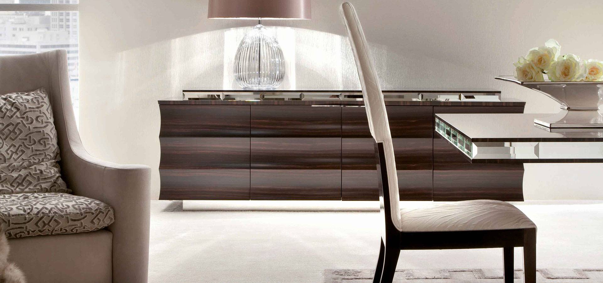 4 door buffet with satin finish makassar ebony veneer. The two center doors have a led light system with sensors. Top features beveled mirror inserts on the borders and a chrome stainless steel top inlay.