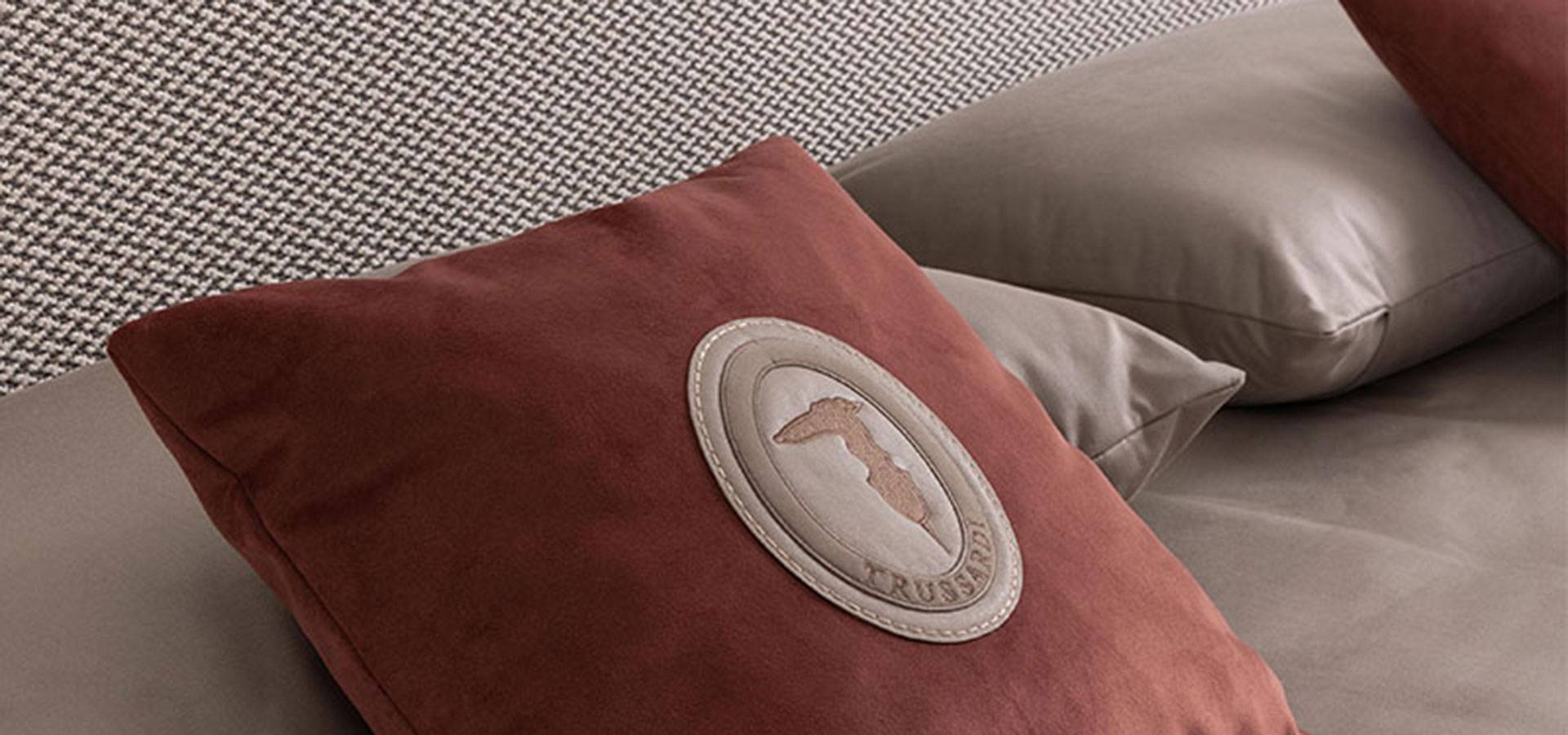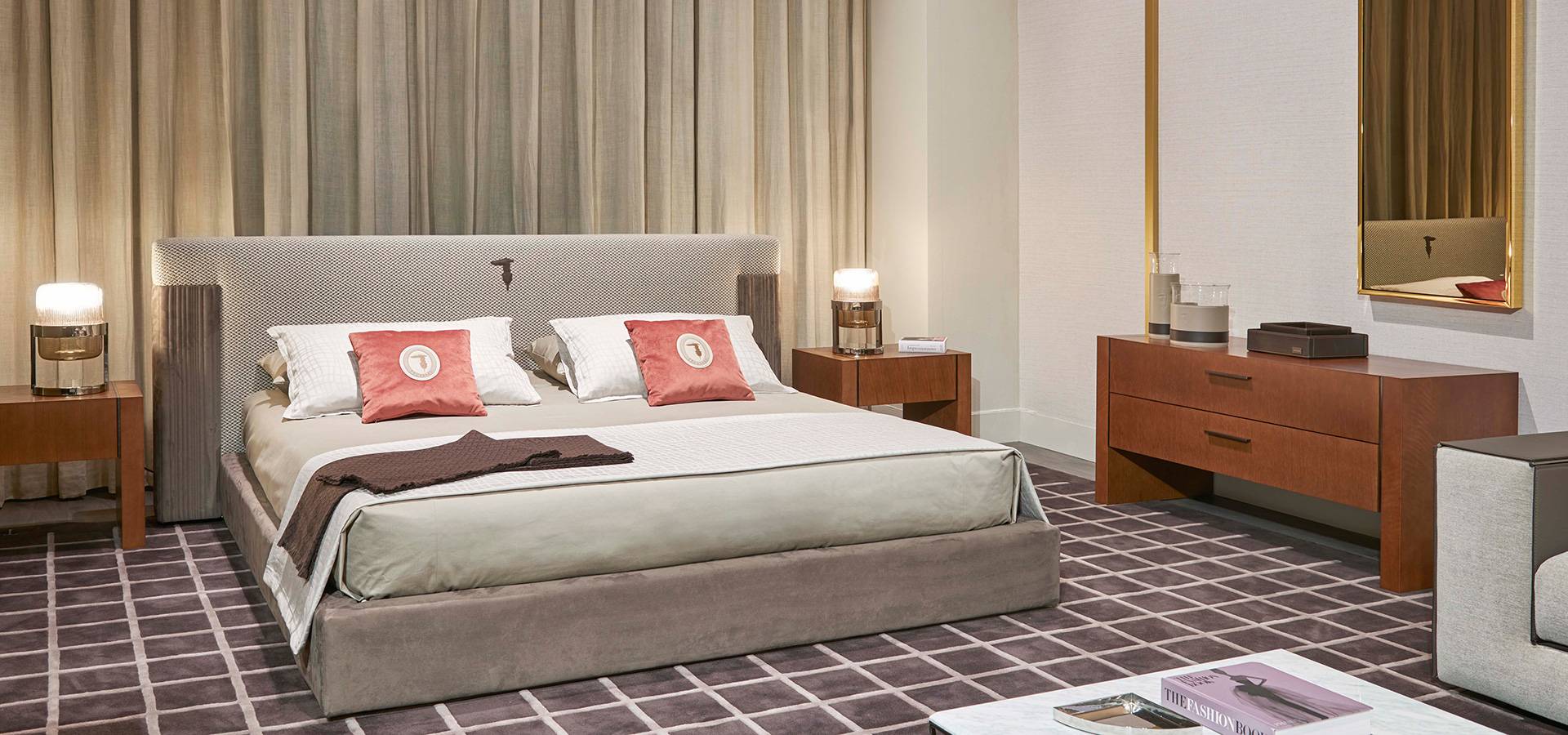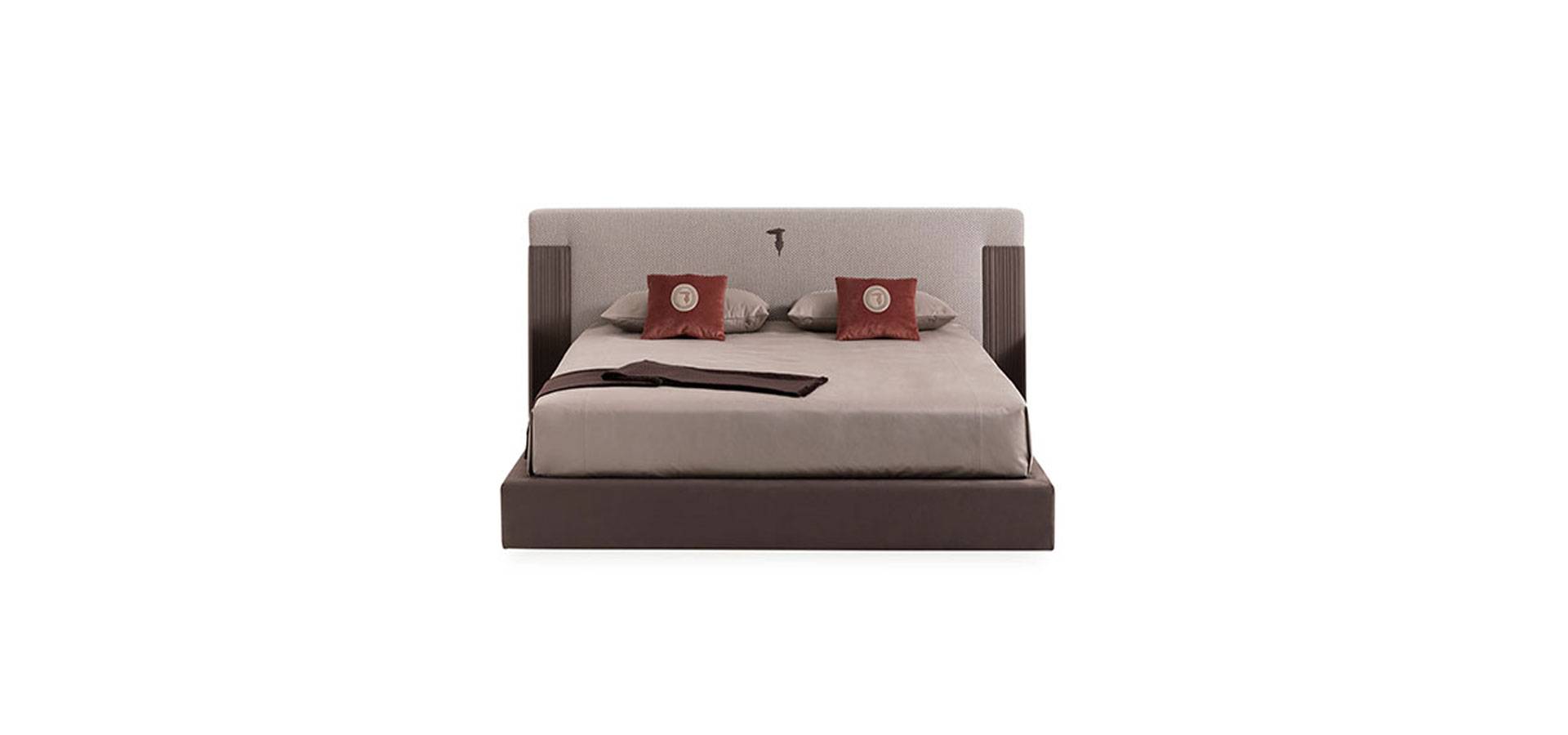 The leather headboard with Vertical quilting, a nod to the Trussardi fashion world, is the Deven bed's distinguishing characteristic. Lightweight, angular lines contrast with the bed's softness.