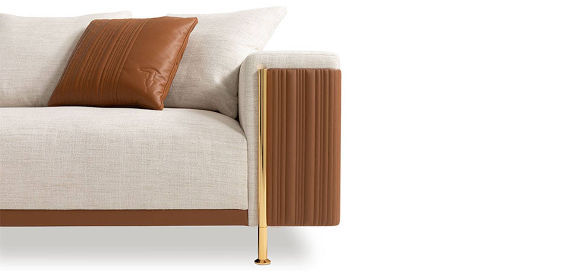 The leather Vertical quilting applied to the armrests of the Deven couch and armchair is reminiscent of the Trussardi fashion world. The shape is defined by light, square lines that are softened by the presence of steel feet in gunmetal grey, polished brass, or Dark Matt Bronze with an engraved Greyhound logo.