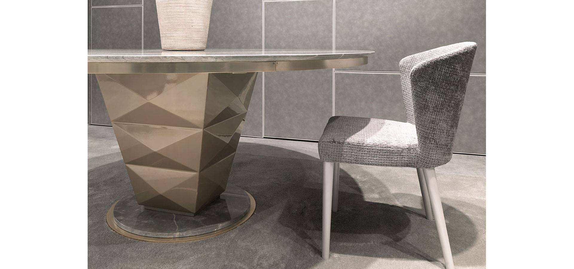 Erik is a colossal dining table with a polished and understated elegance. The sturdy middle leg is made of wood with a diamond-shaped surface and comes in a wide range of finishes to match the metal-framed circular tops. Tops come in a variety of finishes, including lacquered wood, exquisite marble, and mirror surfaces. Erik is the ideal table for major dining rooms, thanks to its marble platform and metal design.