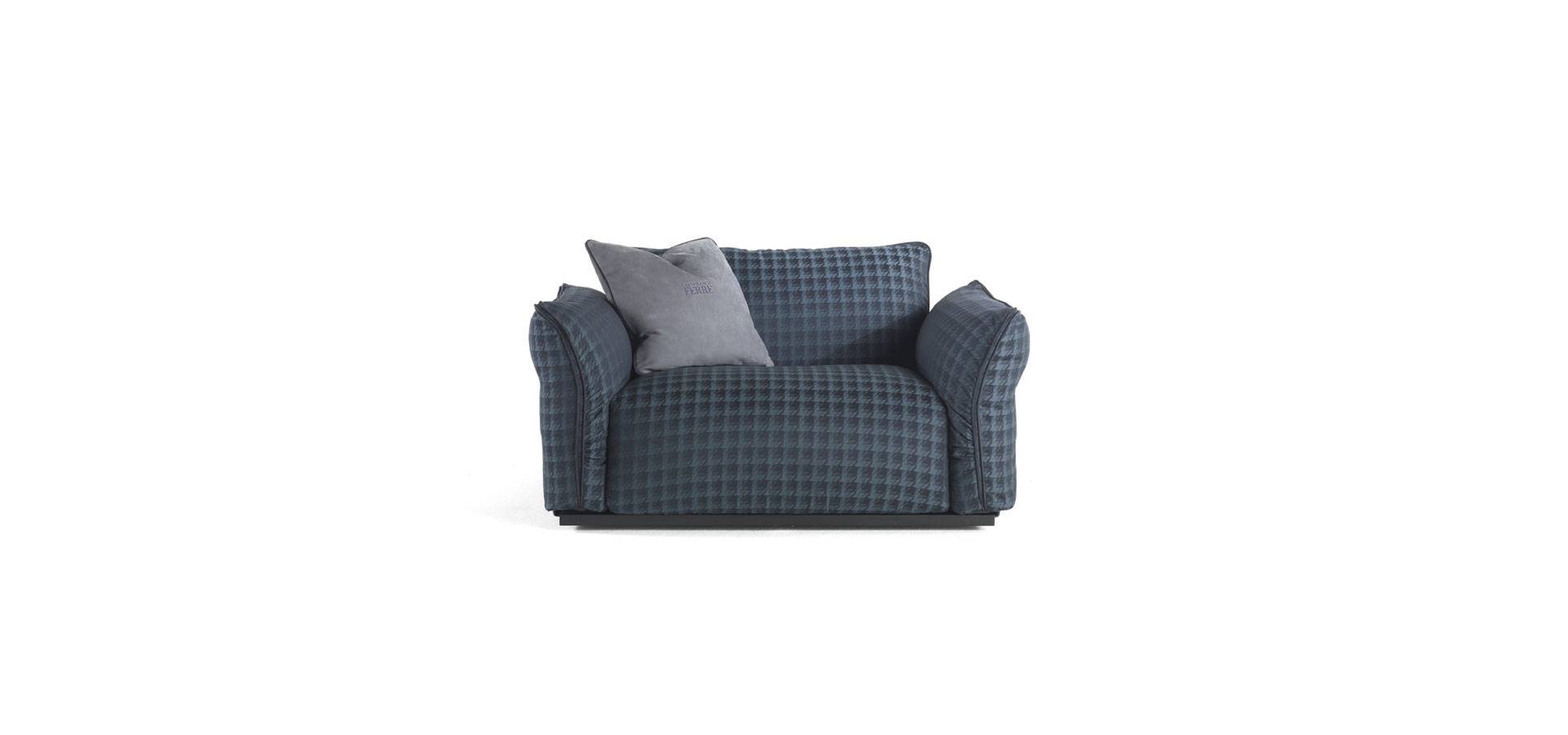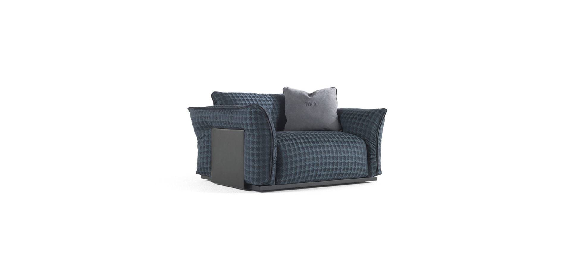 An appealing armchair with a comfortable seat and a modern design. The external plates in metal upholstered in leather, as well as the piping in the same material, emphasize the geometric volumes. The upholstery in fabrics inspired by men's fashion, such as houndstooth, or in leather, adds to the sofa's urban charm, bringing it in line with Gianfranco Ferré Home's identity.