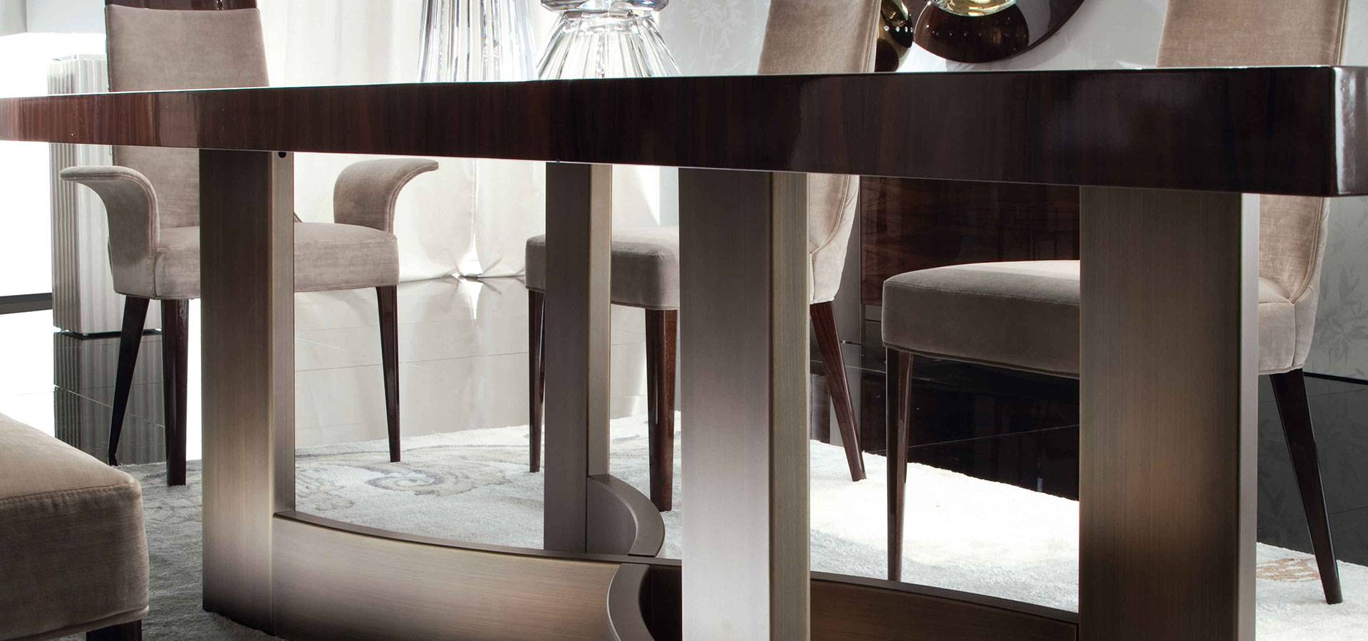 Rectangular table with a high gloss polyester finish and a veneer of Brazilian rosewood. Bronzed stainless steel fixed top and base Top with sunburst veneer.