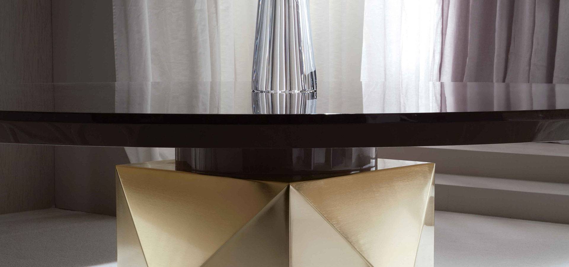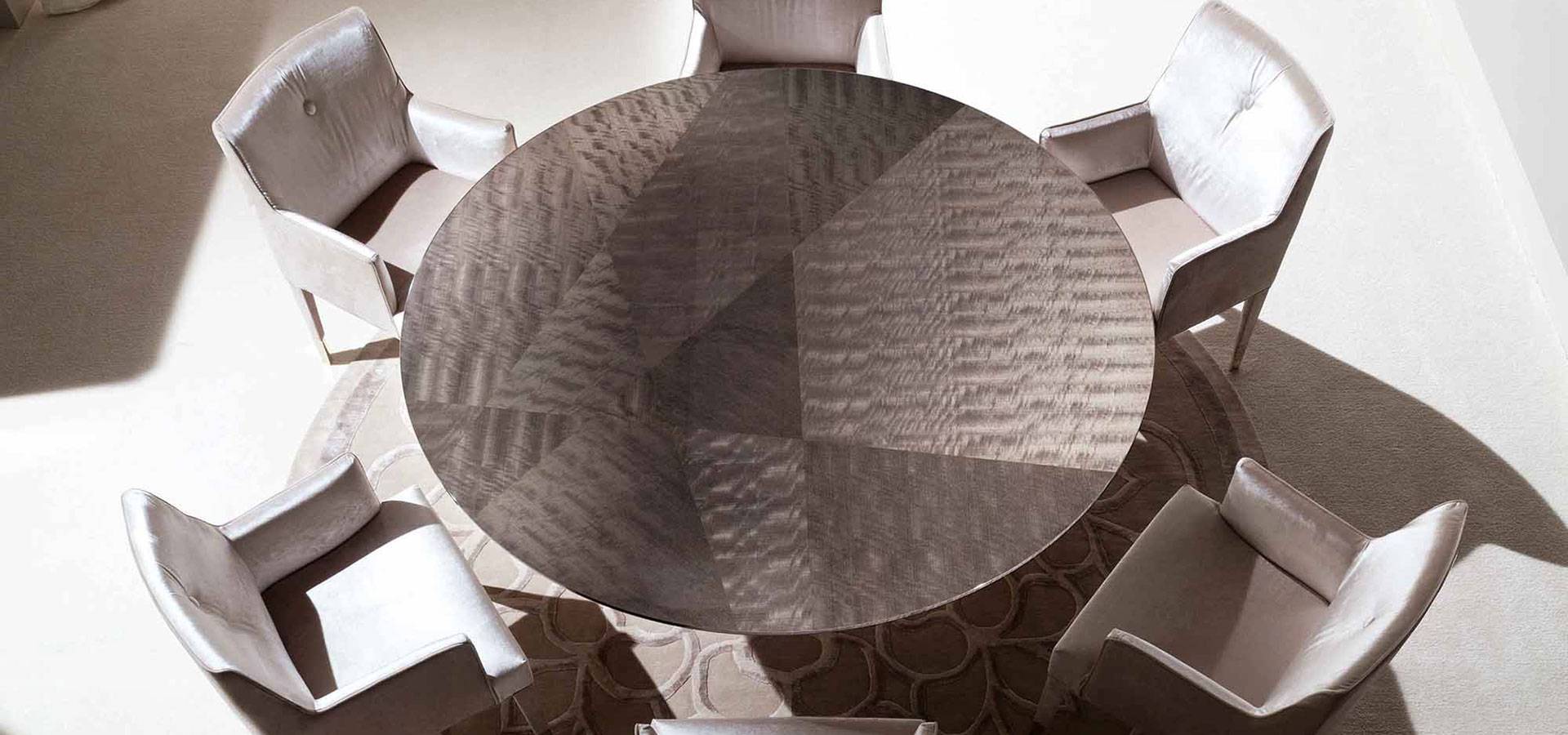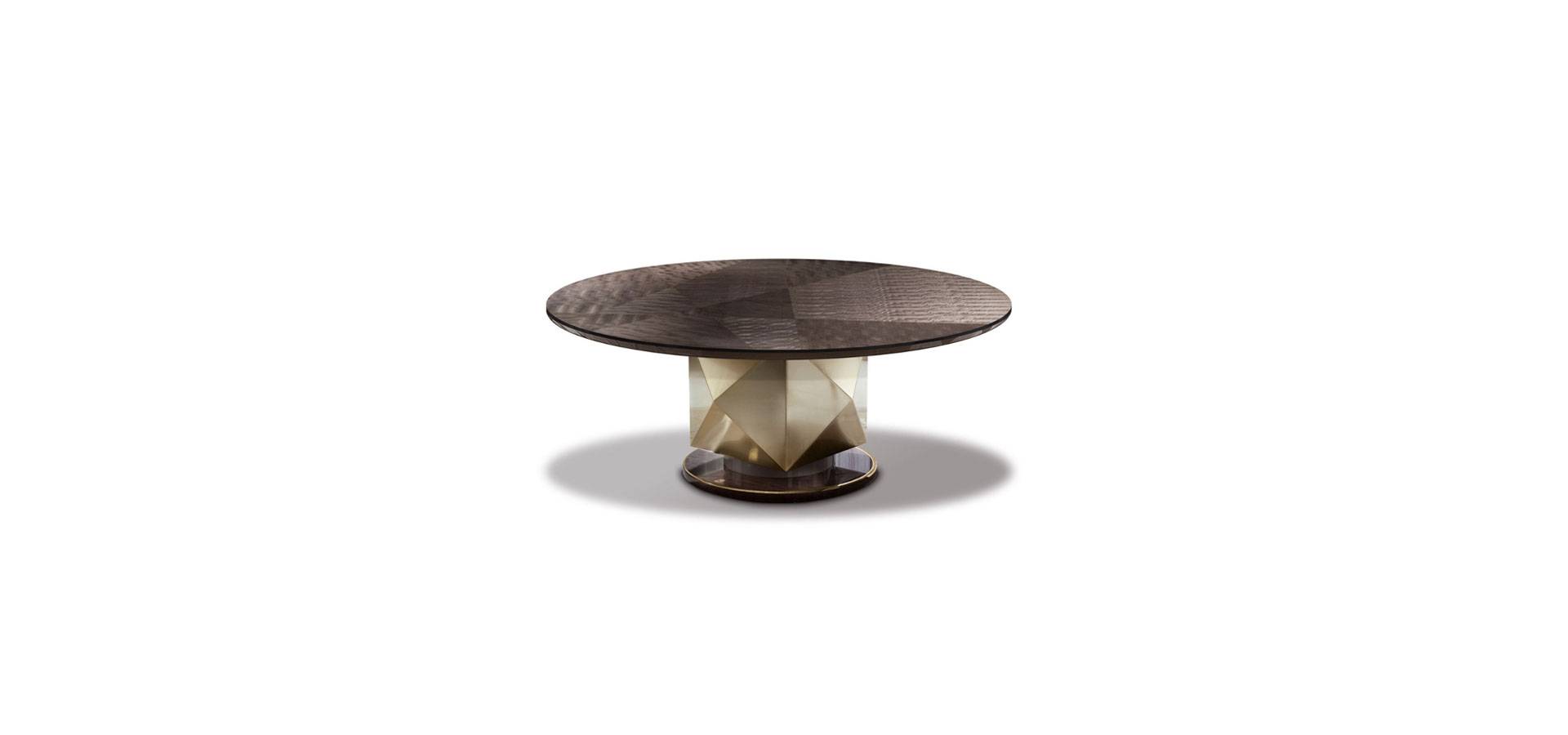 Makorè mahogany veneer round table with high gloss polyester finish. Metal base with Giorgio Collection emblem and fixed top. Top with inlaid veneer. Stainless steel details in light gold chrome.