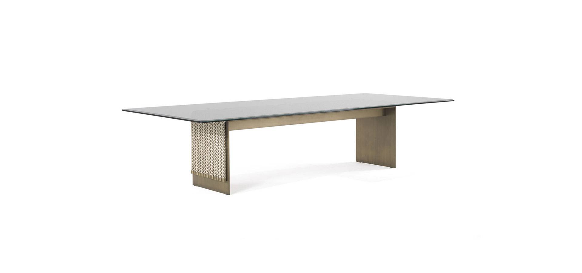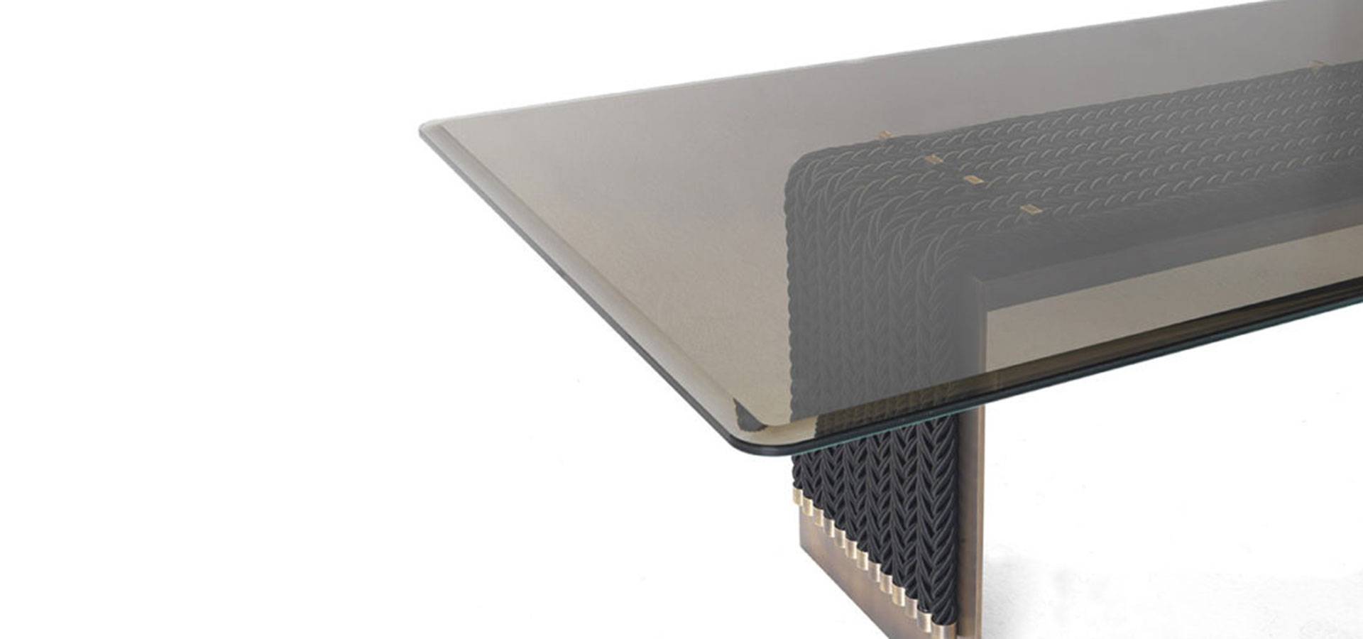 The dining table is an evolution of the Glasgow line, which was first shown at the Salone del Mobile in 2018. It combines the linearity of the design with the complexity of the craftsmanship. It features a top in coupled glass bronzed glass and a metal structure with a bronze finish, as well as decorative strings.