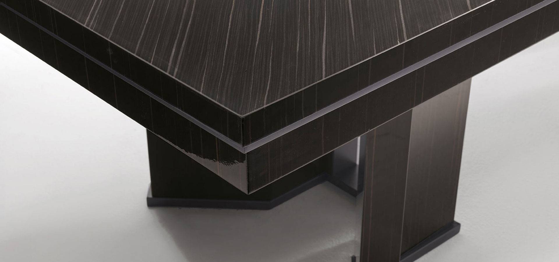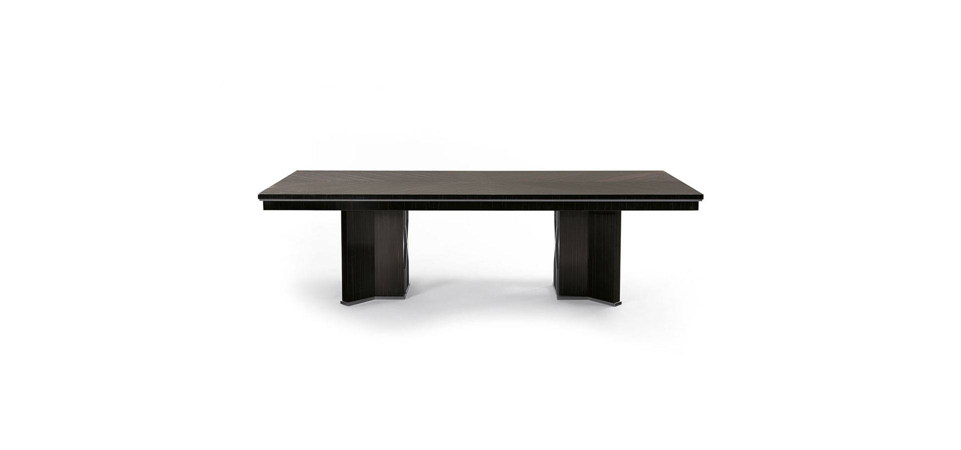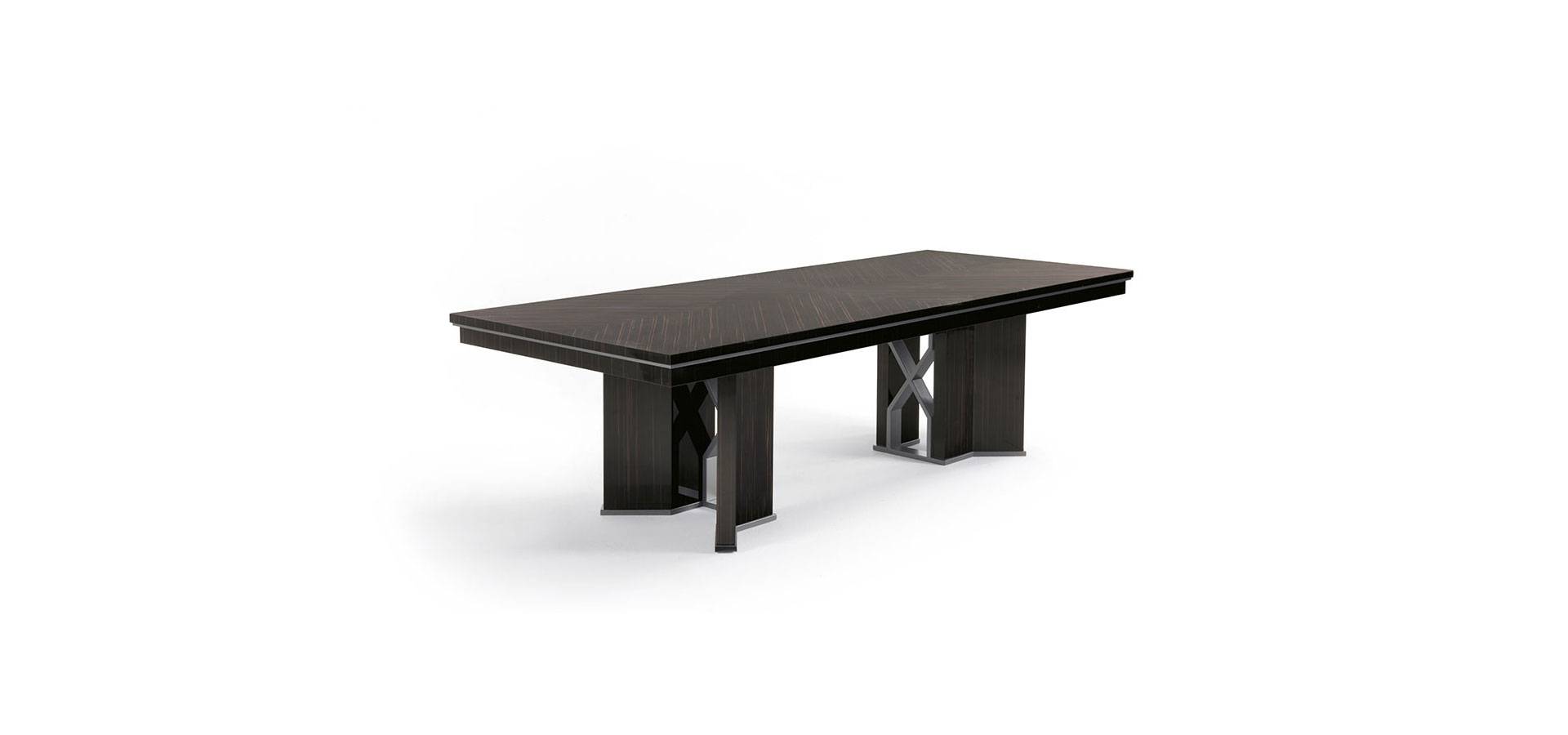 The Grimaldi table set, which comes in round and rectangular varieties, emphasizes the contrast between the wood of the structure and the metal elements in the top thickness and legs. The metal detail that forms a particular pattern, such as a fil rouge that runs along the table and is replicated in the leg with a cross-line design, is highlighted on the top. In its strict lines, this table is substantial and austere.