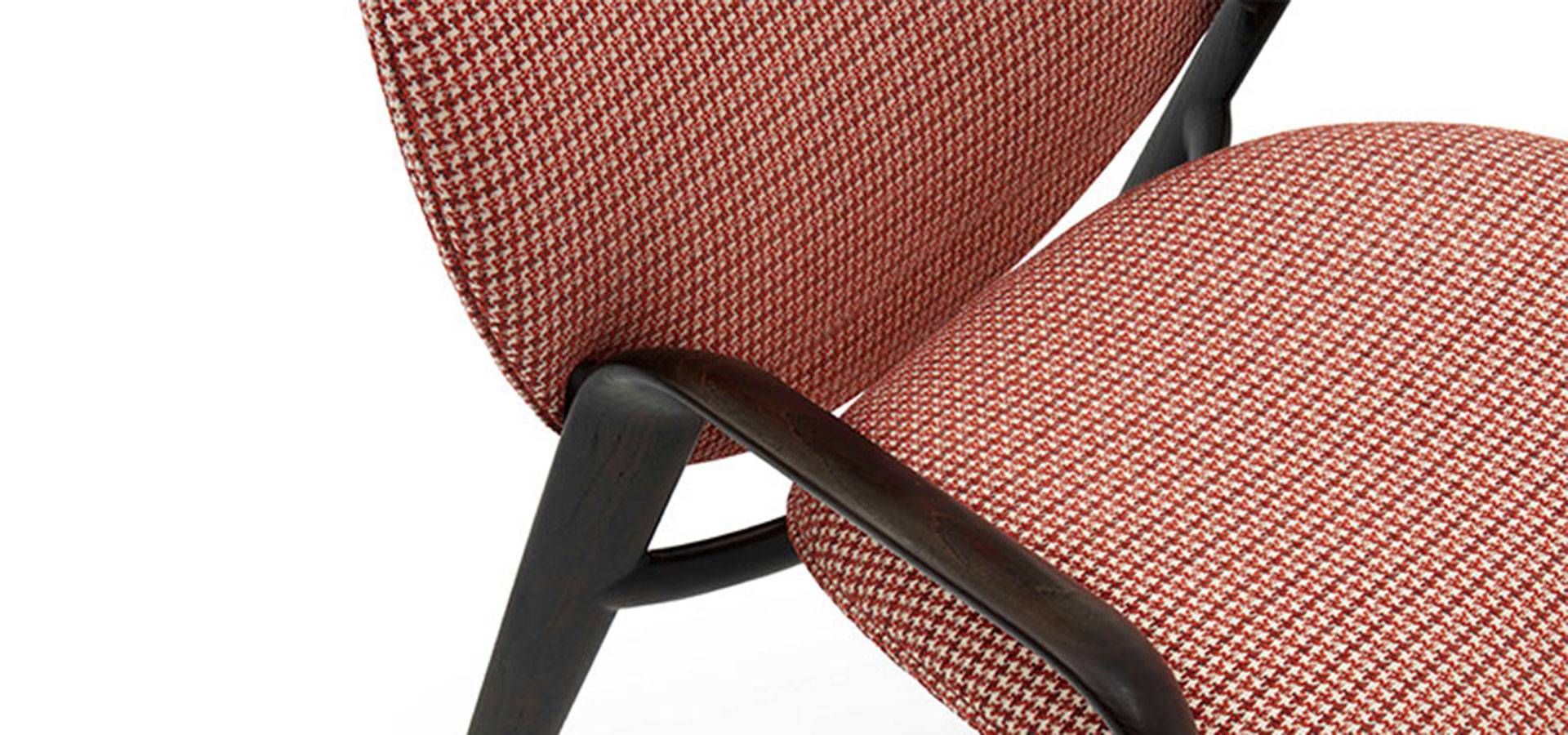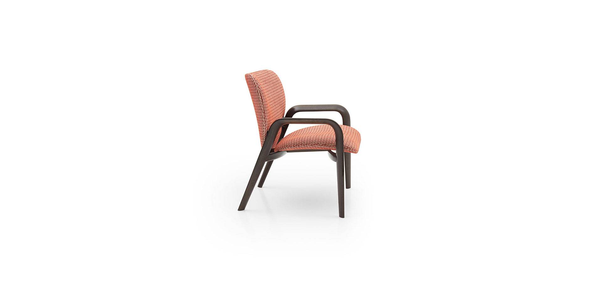 Hester is highlighted by a broad back that is suavely open towards the top, like the delicate shape of a petal, and features elegant detailing. The armchair is available in leather or fabric, with an embroidered Oval Logo on the back.