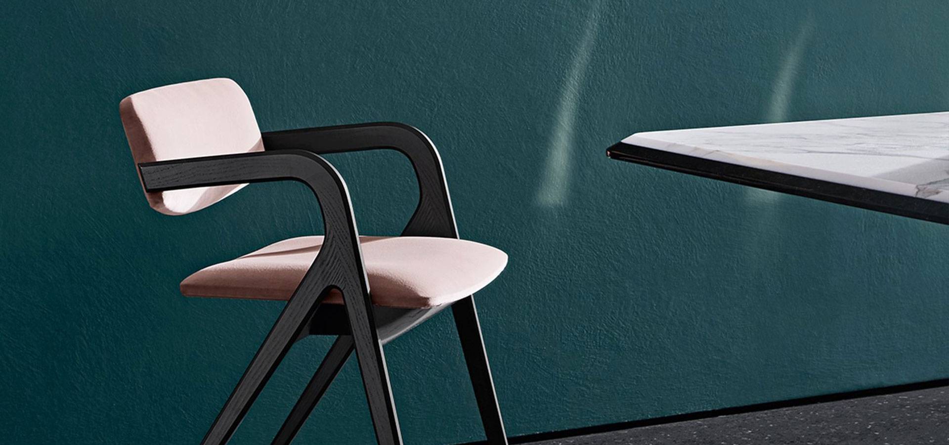 Chair with open pore solid curved ash structure in black lacquer. Natural ash, tobacco stained ash, and white open pore lacquered ash are also available. Seat having a wood inside construction and non-deformable polyurethane foam padding. Backrest constructed of flexible polyurethane foam dipped in structural polyurethane. Fabric or leather, depending on the samples. Cover is not detachable.