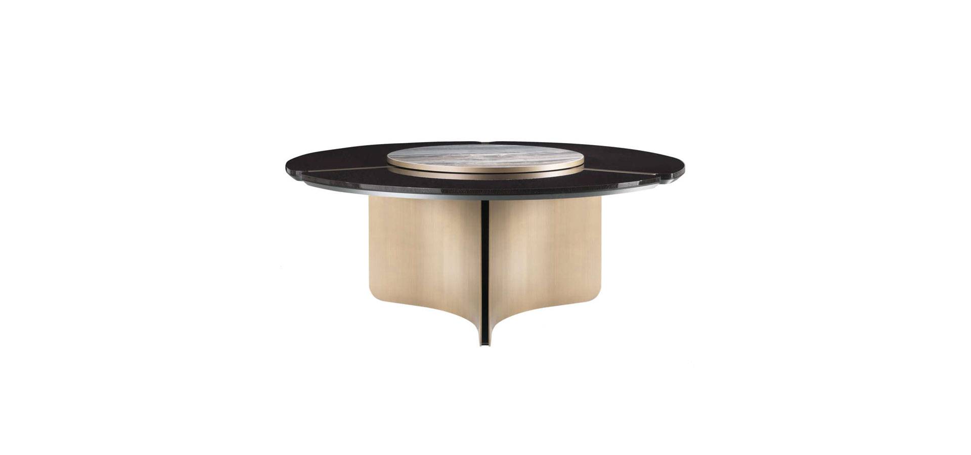 Kibo is a sculptural table with a lot of personality that blurs the line between art and design. It's a table with a lot of visual impact. The table is a complicated composition and an expression of great craftsmanship. A grey Carbalho essence gloss surface is coupled with a Grey Porcelain Gres Lazy Susan: a combination of materials and colours that brings refined light and reflections to life.