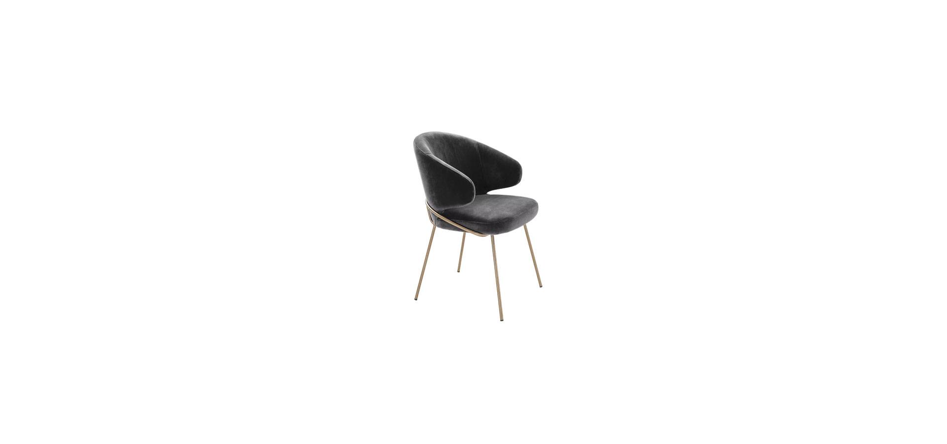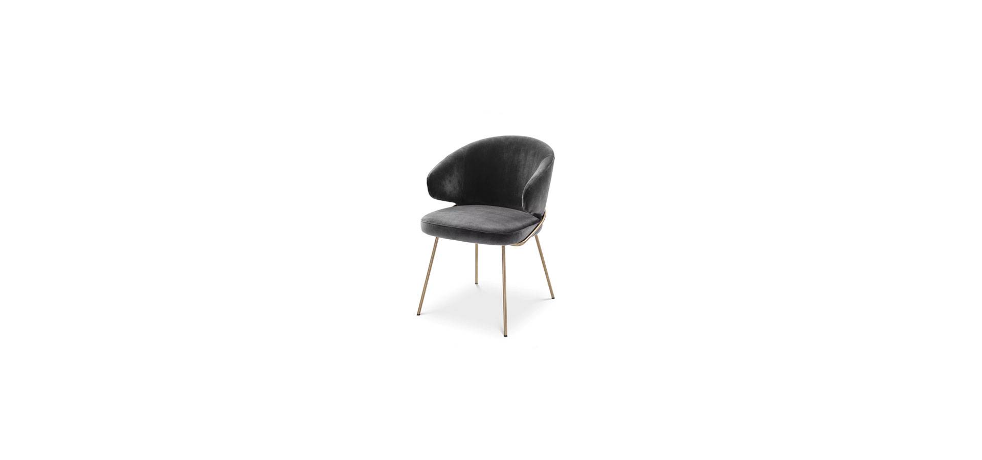 With the Kinley Dining Chair, you can entertain your guests in style. This eye-catching armchair exudes Mid-Century Modern style, with a bent backrest and seat in Savona grey velvet upholstery and brushed brass legs.
