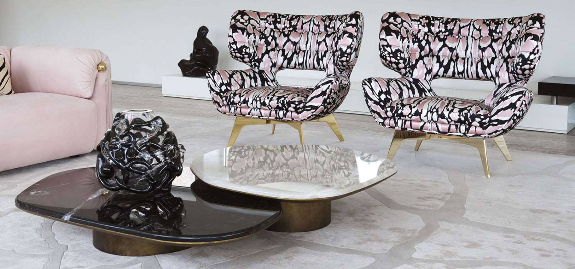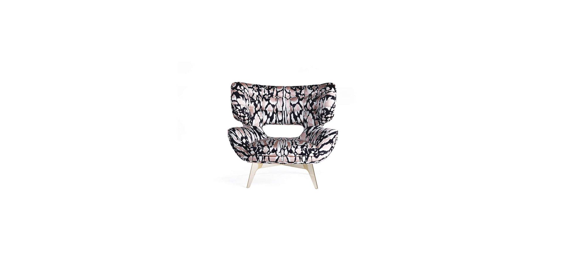 The exuberant and sophisticated armchair adds a chic and contemporary touch to the living area with its distinct 50s style. Maclaine is available in a variety of finishes, including this new silk with lynx print.
