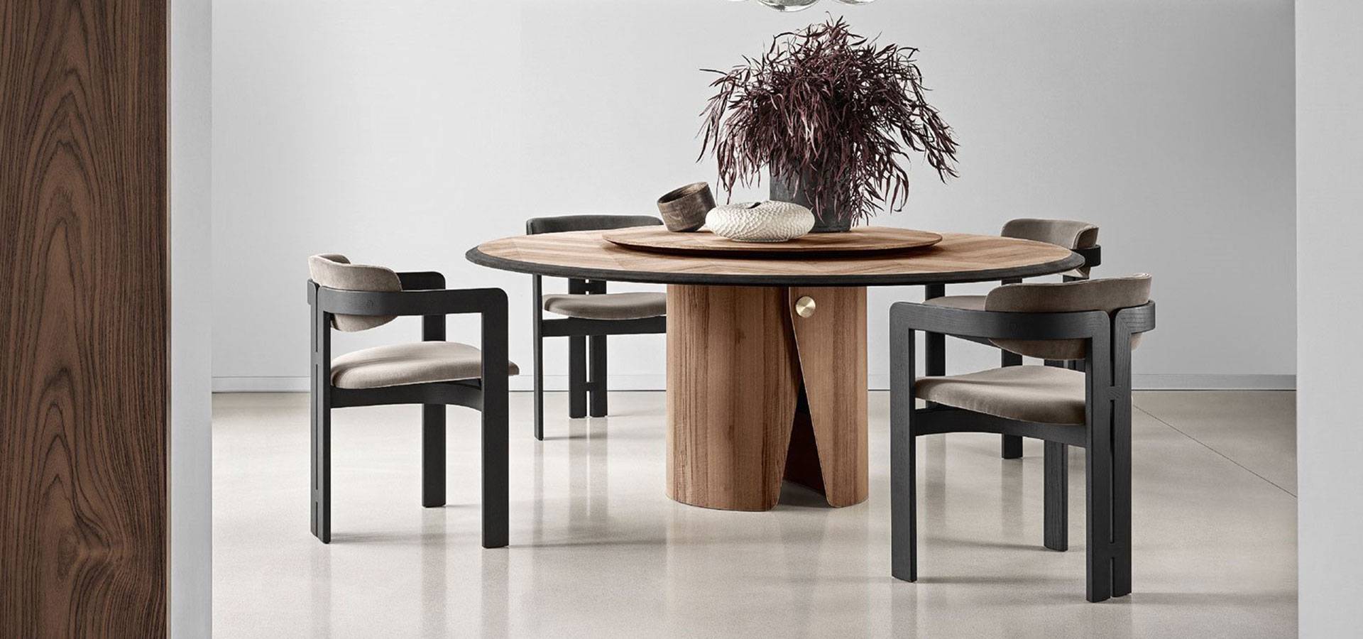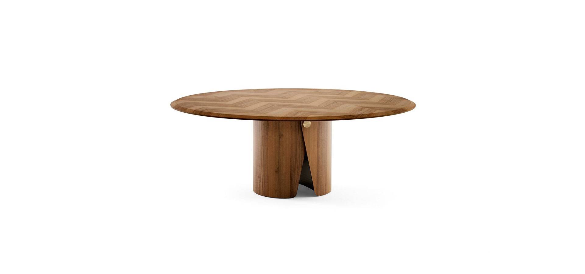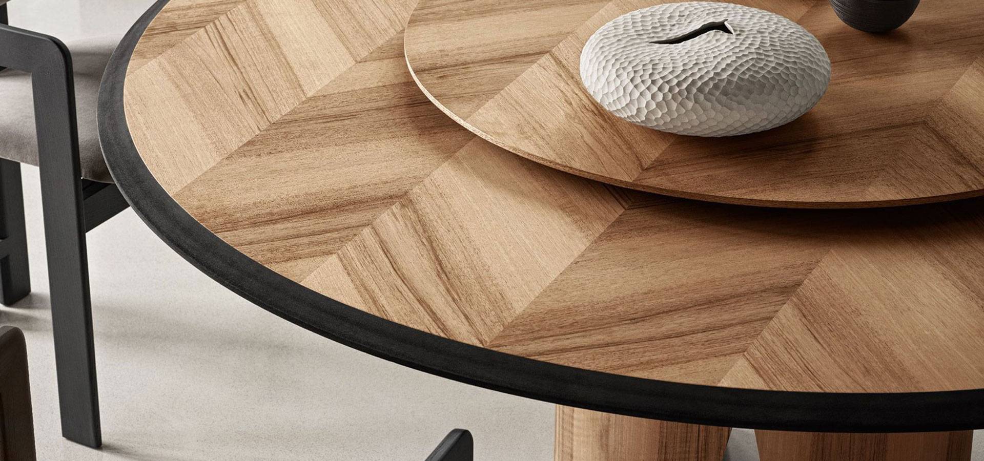 Tabletop with Frisè Walnut herringbone wood inlay and black bevelled edge in "Colore." Frisè Walnut, dark grey Frisé Maple, or white Frisè Tanganika with bevelled edge in the same finish are also available. Satin brass button on curved base. On request, a resting lazy susan is offered in the same finishes as the tabletop.