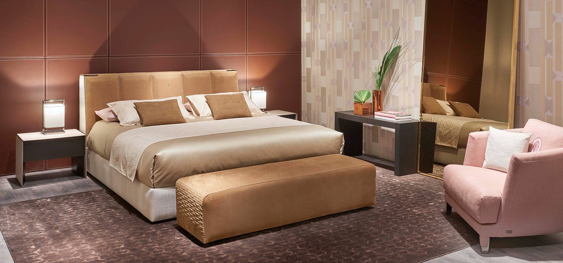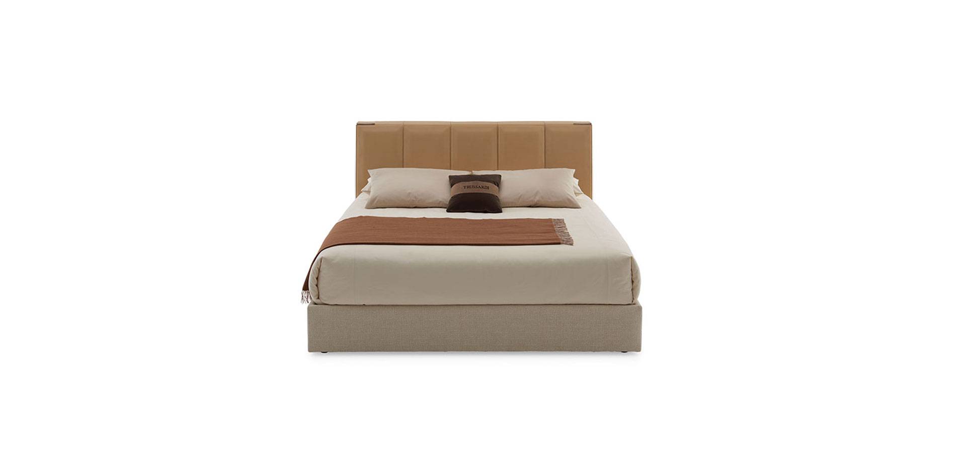 Marris is the bed that completes the seat lines that bear his name. Its form is elegant and reasonable, defined by a leather element made with enormous vertical lozenges that entirely envelops the surface of the huge headboard with squared outlines. Fabric or leather covers the headboard's lateral edges and base. Steel accents in gunmetal grey or polished brass finish.