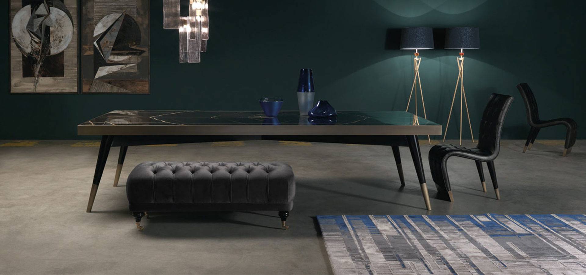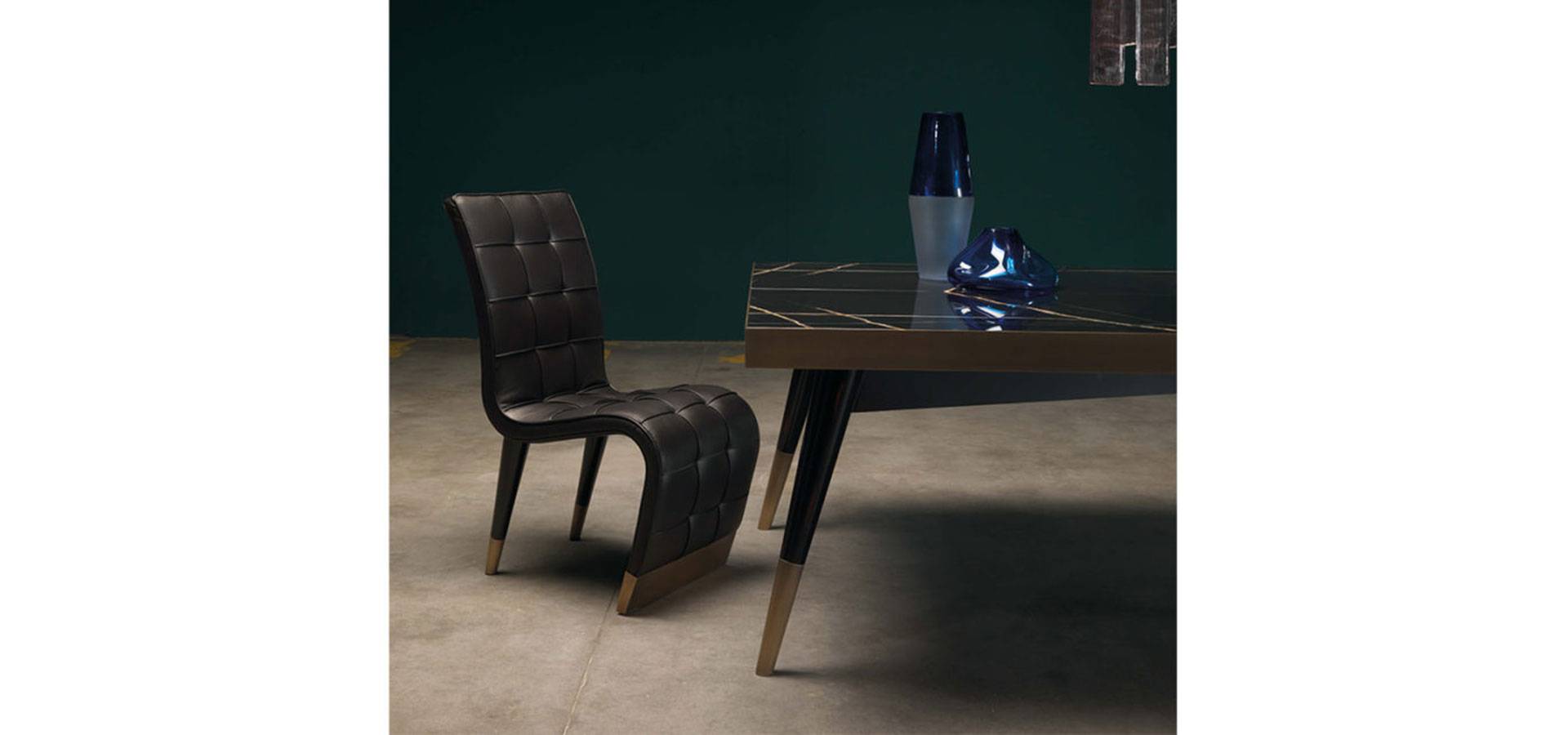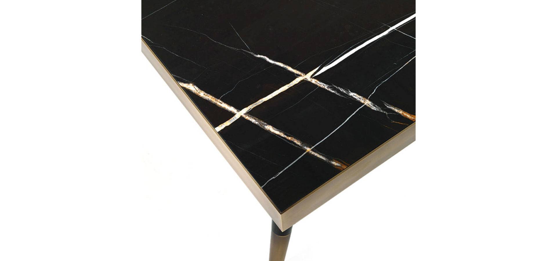 A rectangular version of the Mayfair dining table was introduced this year. The top is made of precious Sahara Noir marble and features a central brass rhombus from which the mirrored marbles are divided. The slim legs, with a black lacquered finish and bronzed brass details, harken back to the 1950s and lend an air of elegance and lightness to the table.