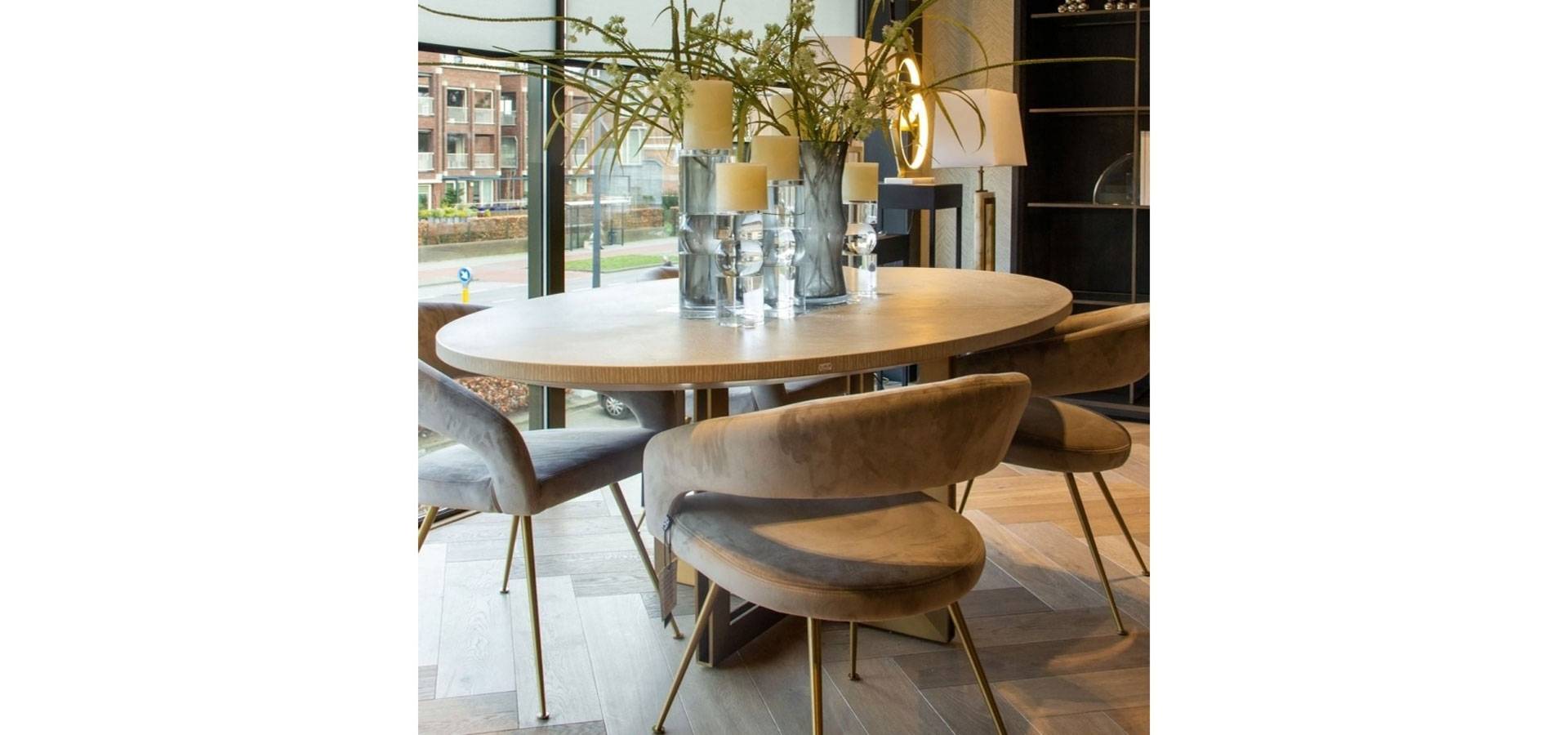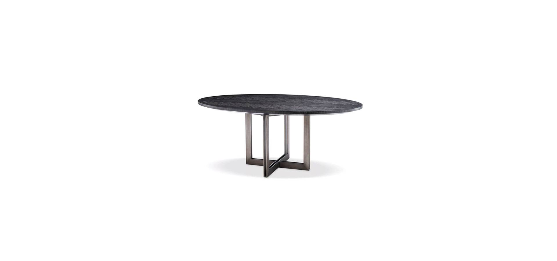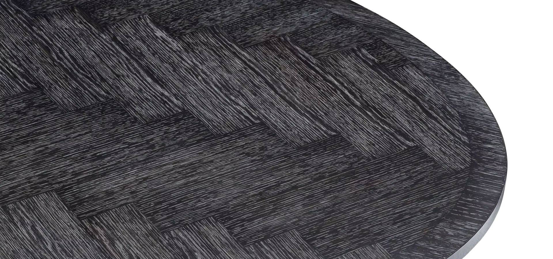 The stunning charcoal oak veneered Melchior Dining Table, with a sturdy base in a bronze finish, will add Mid-Century Modern appeal to your décor. Veneers are ideal for marquetry, as evidenced by the lovely herringbone pattern on this oval dining table. High-quality veneer outlasts solid wood, which warps and cracks over time.