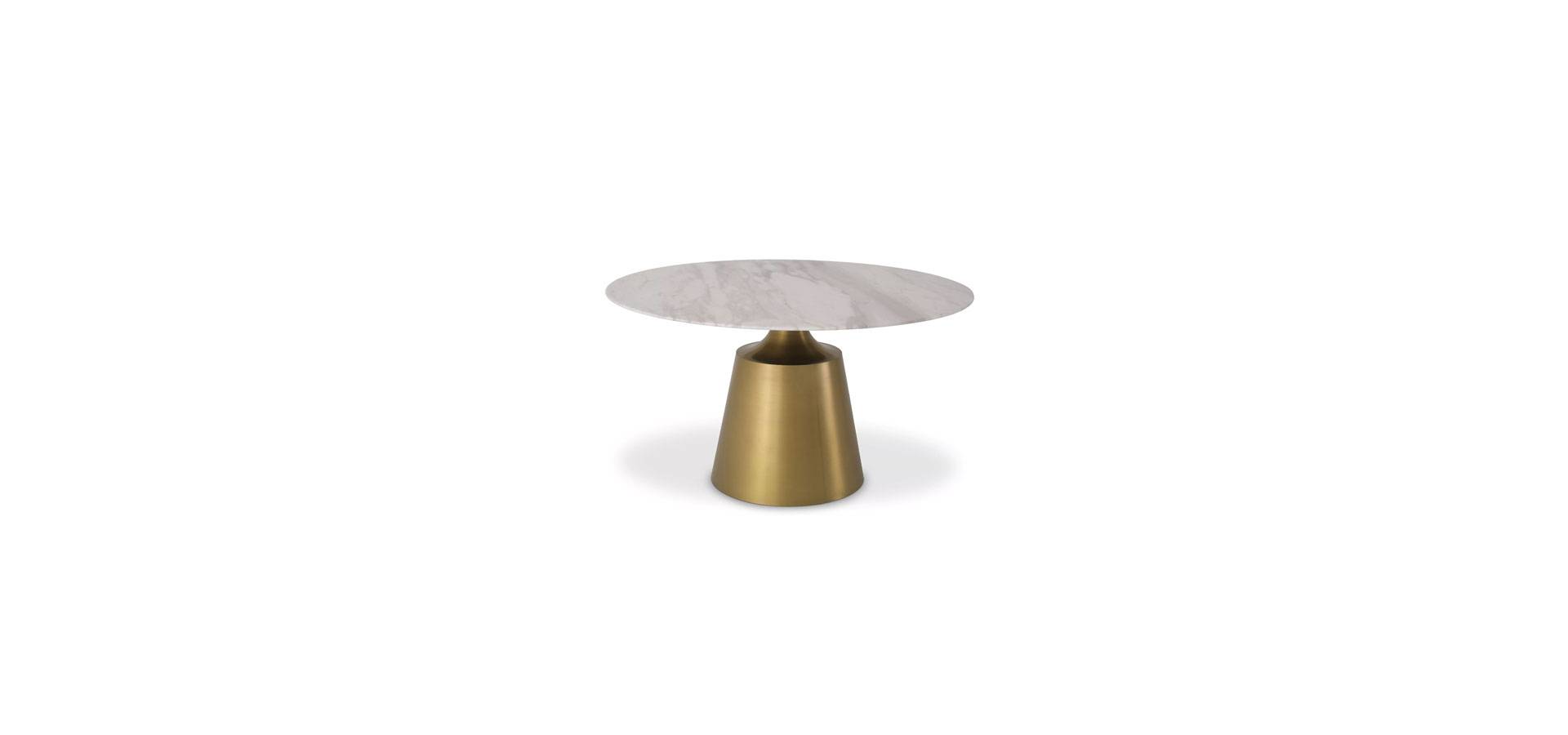 Dining Table Nathan embodies contemporary design with its round marble top of white marble and tapered brass base. Simple, elegant lines allow the noble material to shine. Decorate your home with this sophisticated piece for an undeniably distinguished appearance.
