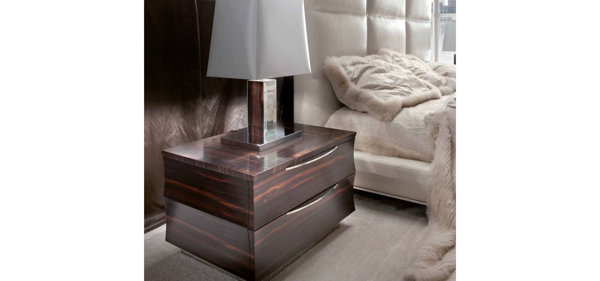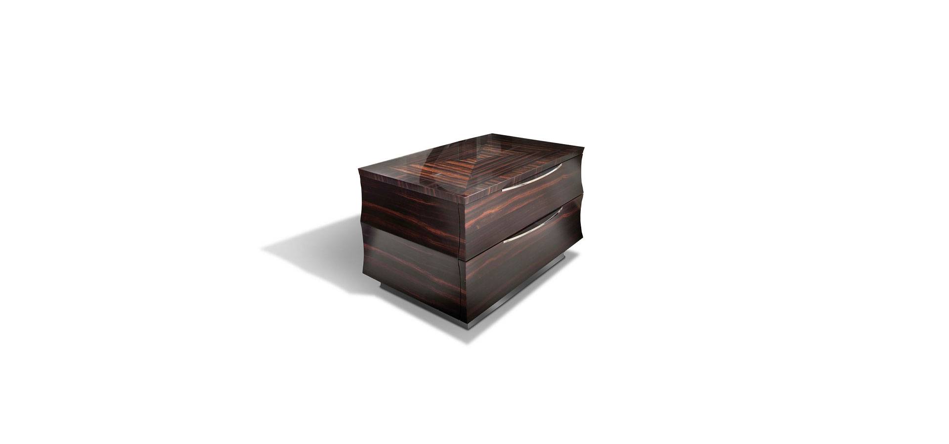 Night table in makassar ebony veneer with a satin finish. 2 full extension drawers with velvet fabric bottoms Inlay of chrome stainless steel on the top. Handles and base are made of chrome stainless steel.