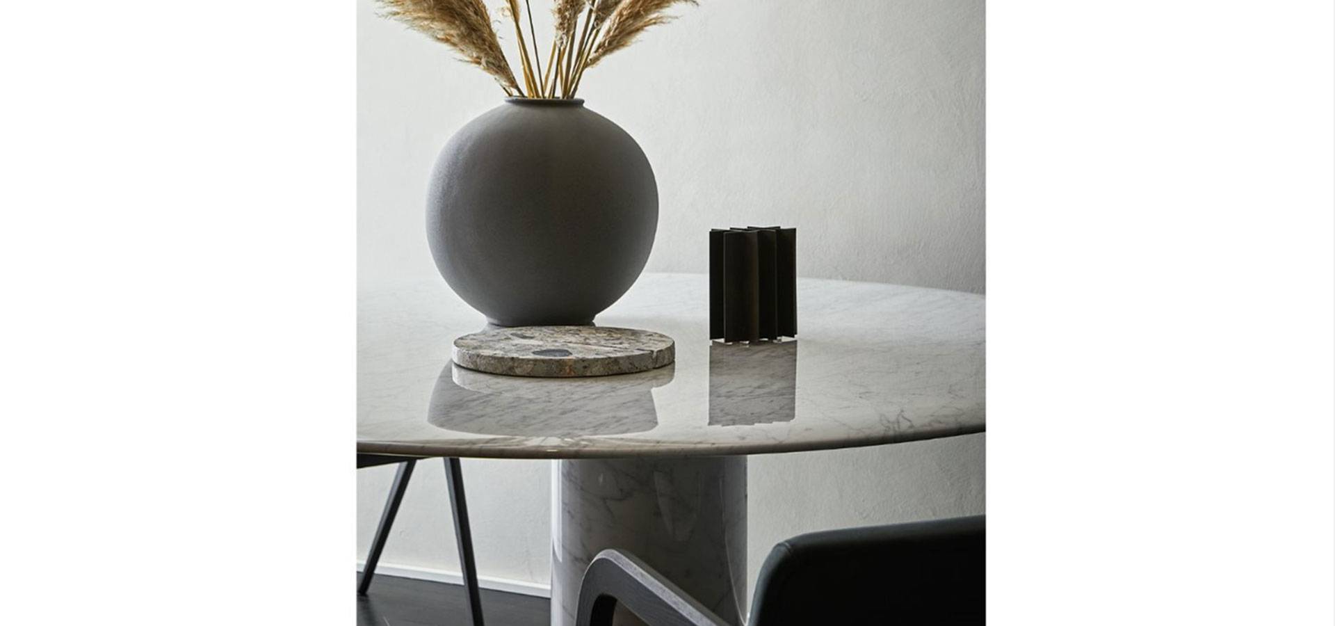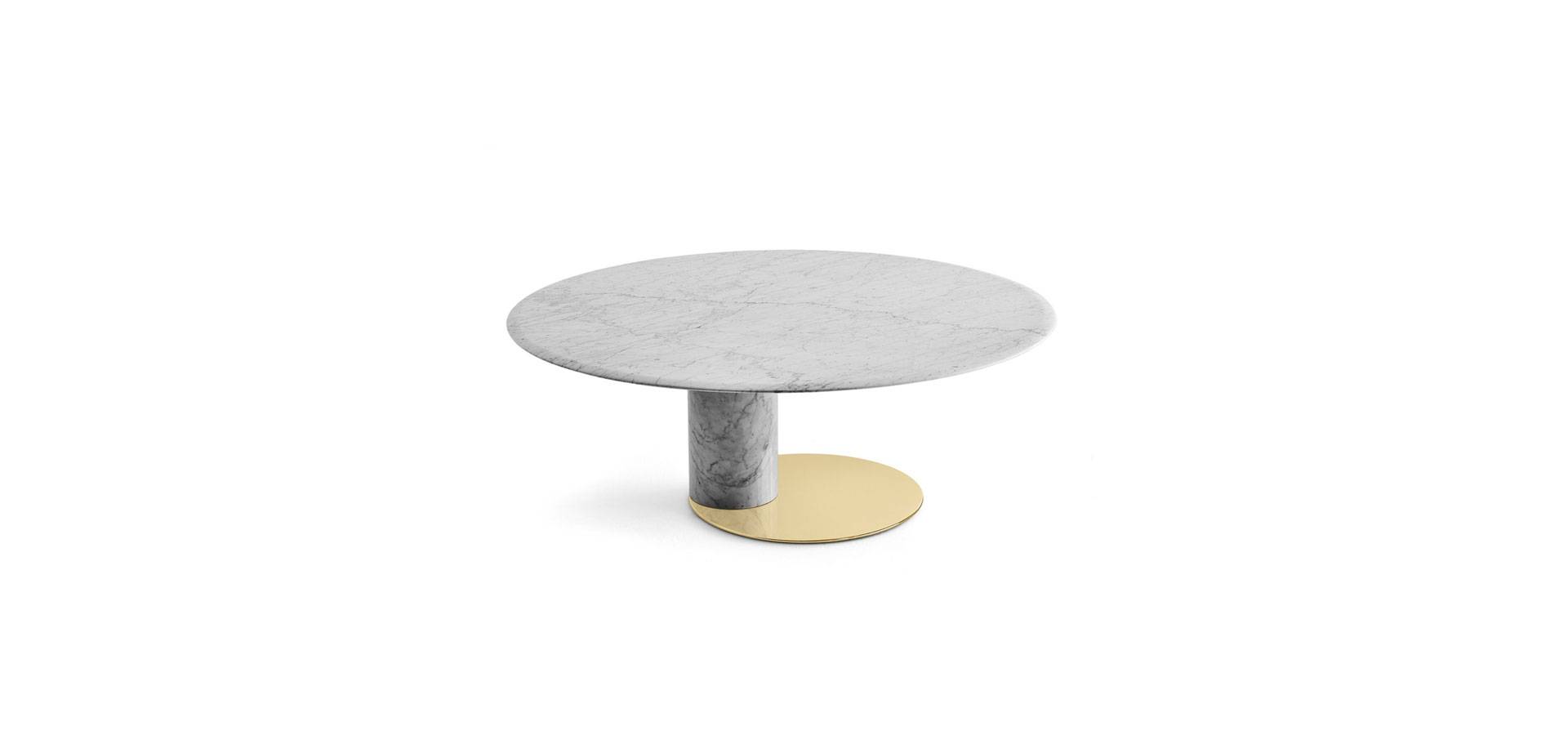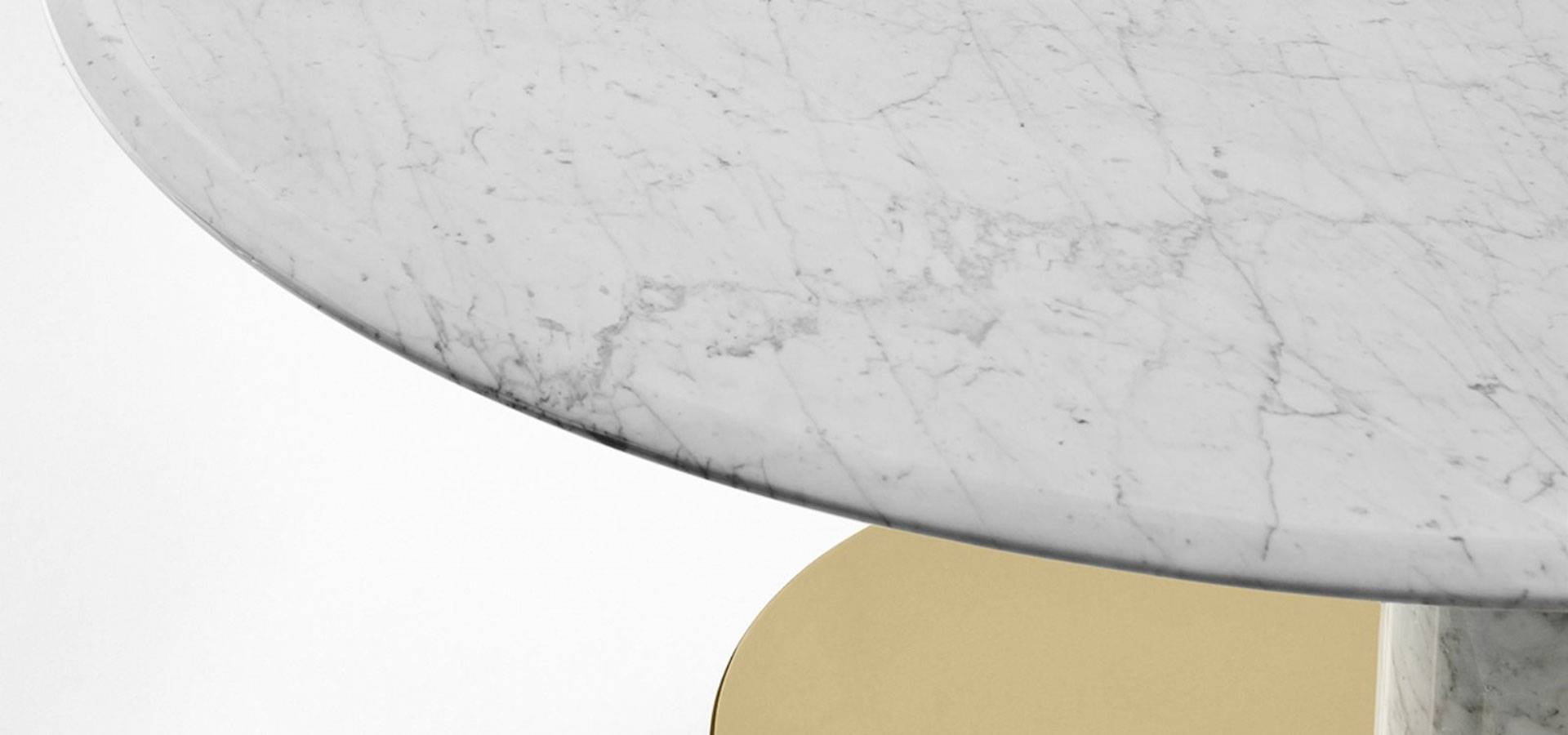 Natural polished Bianco Carrara marble top and base, or honed mat Nero Marquinia marble top and base. Protected stainless steel bottom plate with brass plating. On request, a marble spinning plate rests on the top.