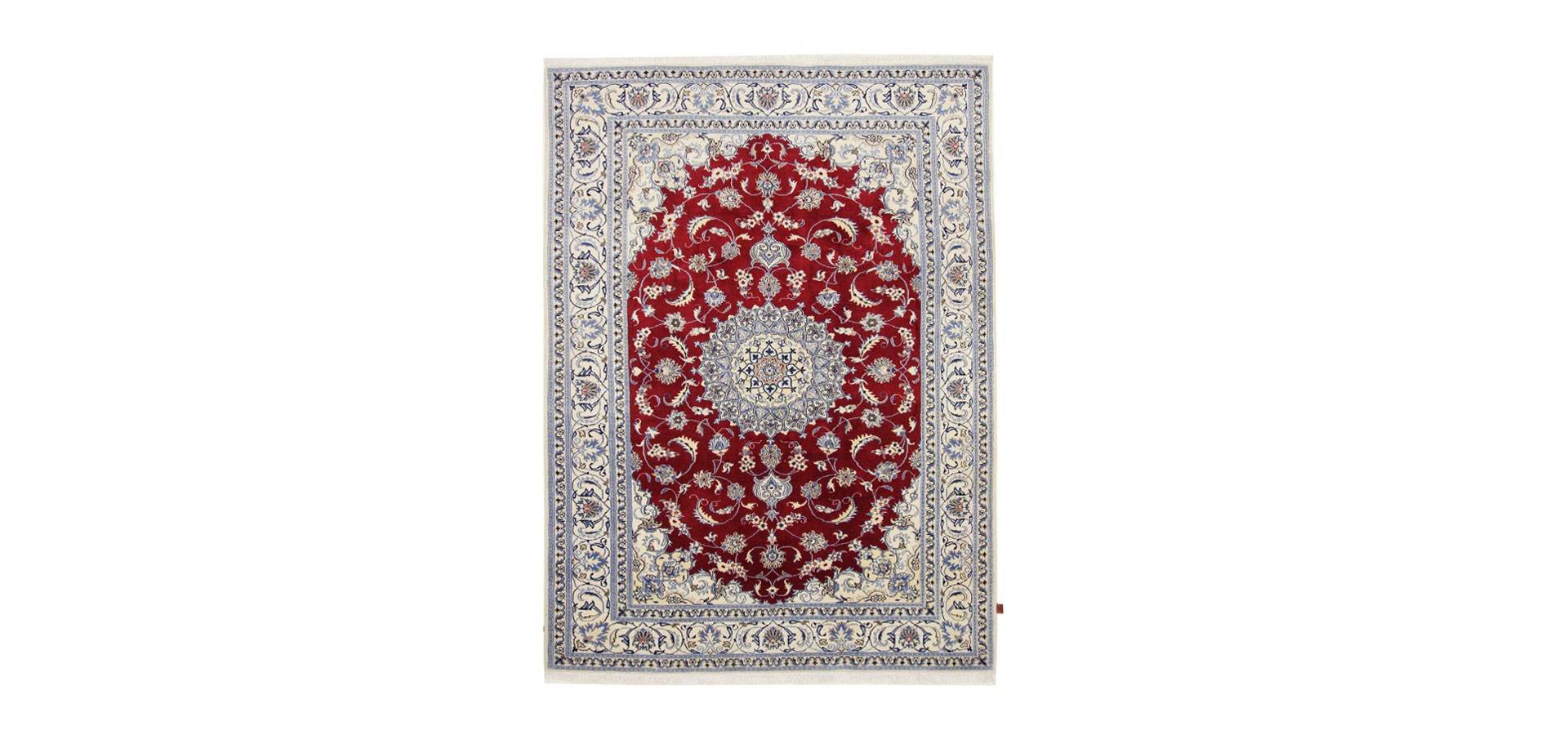 A traditional Nain carpet with a red background and white silk details. A fantastic addition to your modern or traditional interior design.