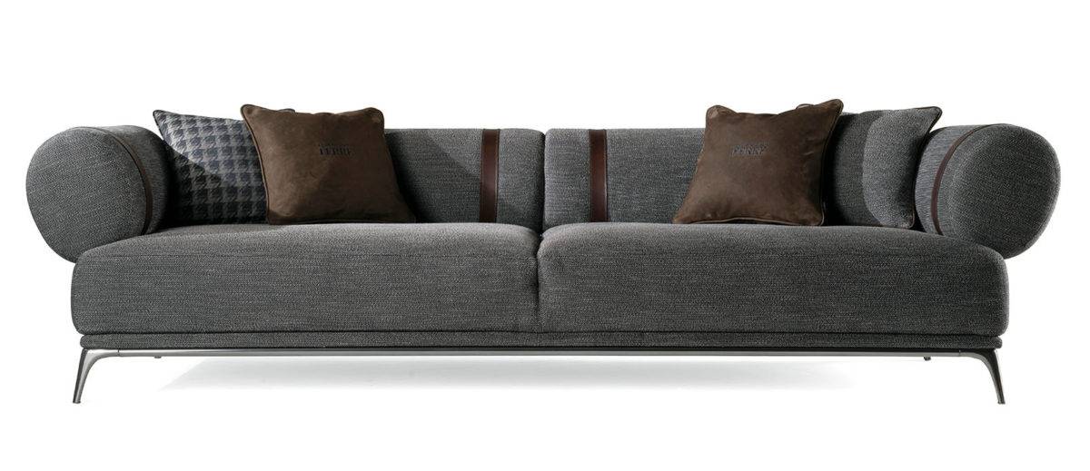 Phoenix sofa recalls design icons with its vintage charm, recognizable style, and elegant silhouette, offering an original re-interpretation of the classic roll arm. It is upholstered in a dark grey fabric and has armrests and a back with an oval section that is slightly inclined outwards, while the metal base is characterized by the black chrome finishing, which is symbolic of the metropolitan mood.